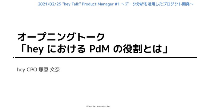 2021/2/25に開催しました "hey Talk" Product Manager #1データ分析を活用したプロダクト開発〜 https://hey.connpass.com/event/202863/ のオープニングトークで、「hey における PdM の役割とは」のお話をした際に利用した資料です。
