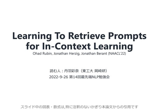紹介論文: Rubin et al., Learning To Retrieve Prompts for In-Context Learning., NAACL 2022 (https://aclanthology.org/2022.naacl-main.191)