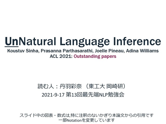 2019] Transformerベースのモデルはある程度構⽂を獲得できている︖ • 内部表現から構⽂チックな特徴が読み取れる • 同様の議論はTransformerだけではなくRNN , CNNでも⾏われてきた しかし実際に構⽂を理解できているかは疑問 • ⼀般的に⾔語現象によって性能にムラがある • Transformerモデルの含意認識はヒューリスティックなルールに依存 • The 𝑁! 𝑃 the 𝑁" 𝑉. ↛ The 𝑁" 𝑉. • The lawyer by the actor ran. ↛ The actor ran. • ⽂法的に正しいか否かを判定するタスクでの性能は⼈間に遠く及ばない [Tom McCoy et al., 2019] [Warstadt et al., 2019b]