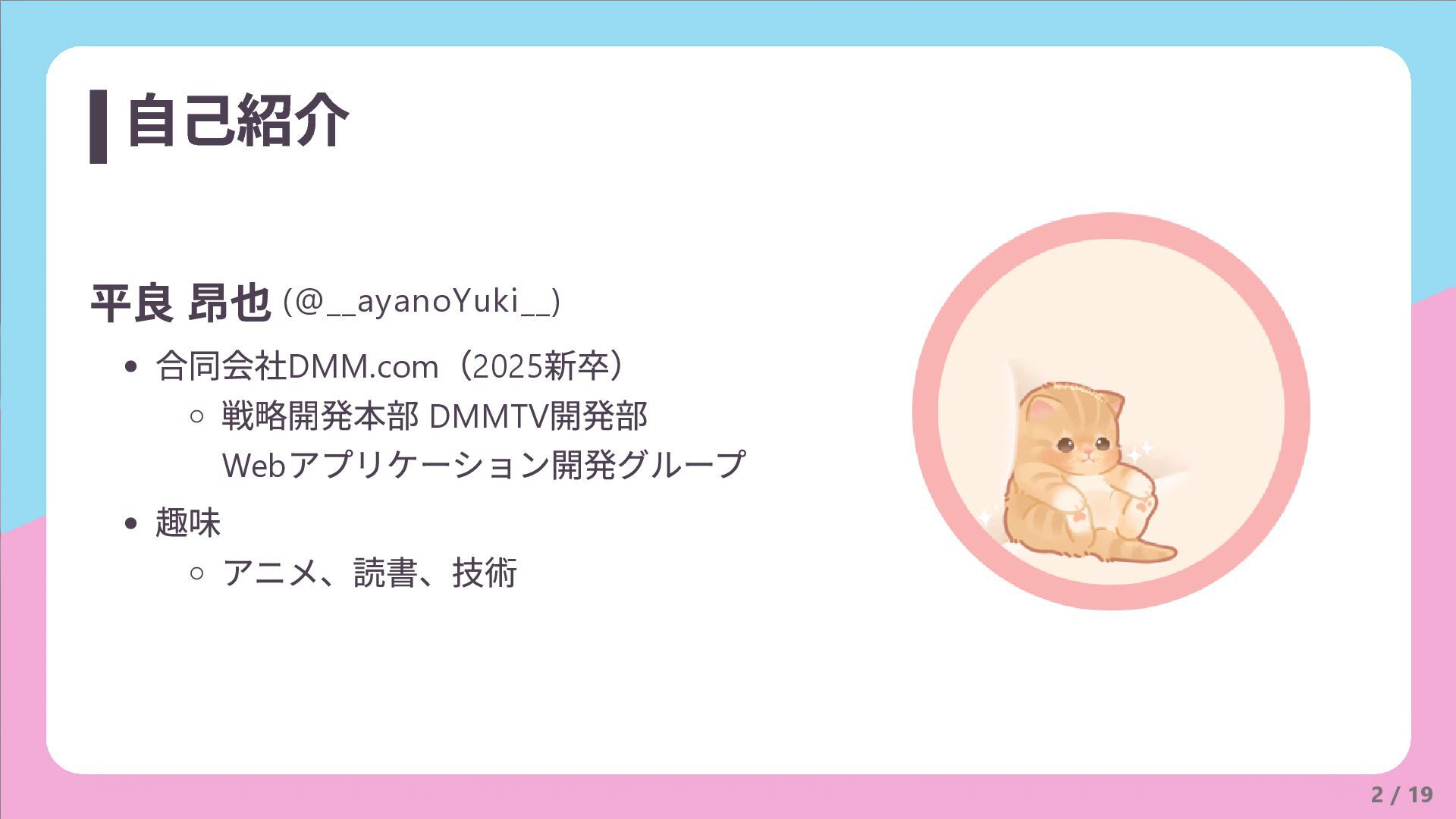 2 / 19 自己紹介 合同会社DMM.com (2025 新卒) 戦略開発本部 DMMTV 開発部