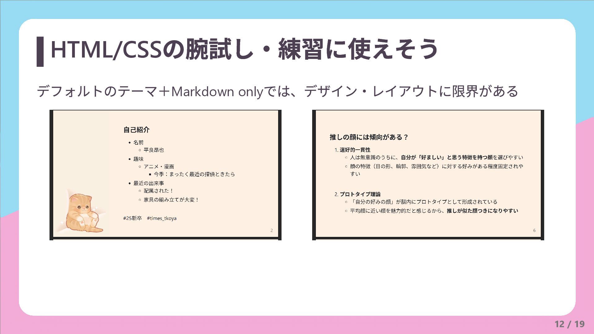 デフォルトのテーマ+Markdown only では、デザイン・レイアウトに限界がある 12 / 19 HTML/CSS の腕試し・練習に使えそう