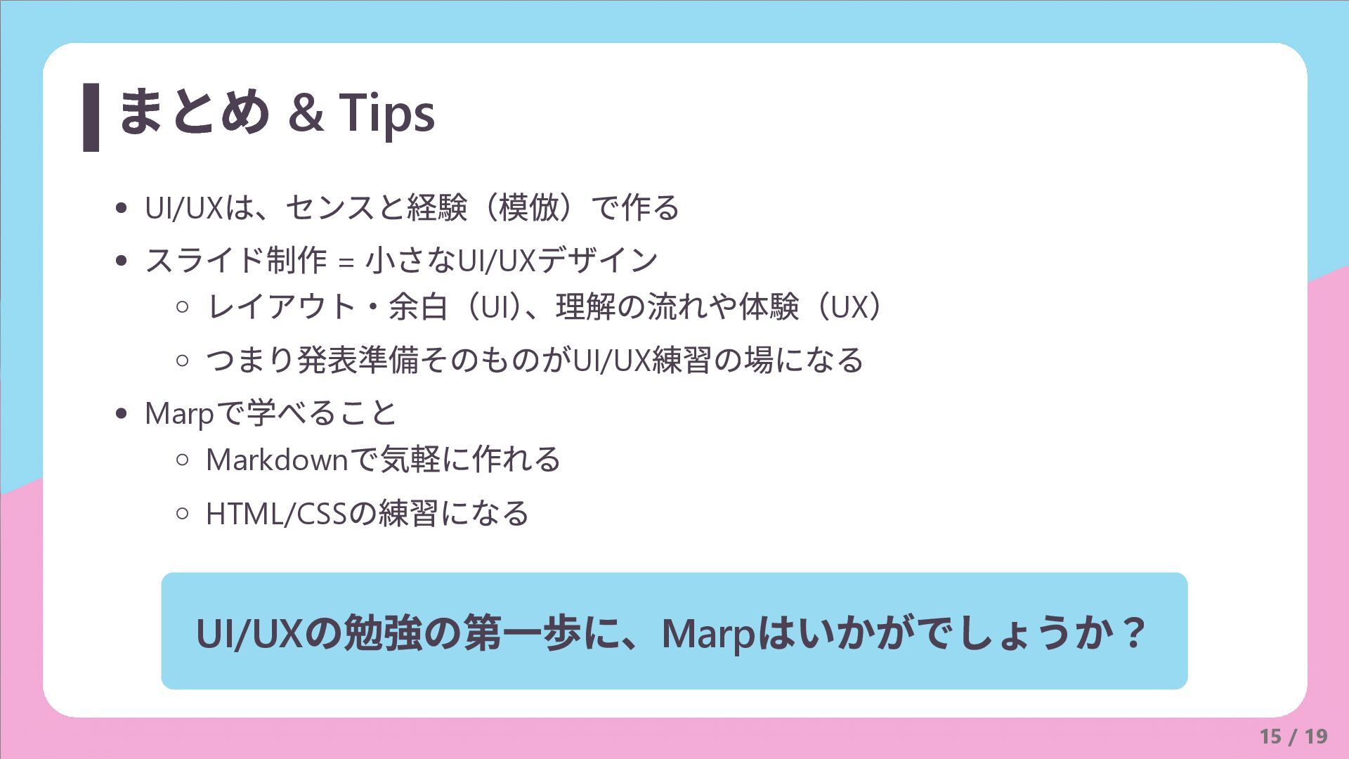 つまり発表準備そのものがUI/UX 練習の場になる Marp で学べること Markdown で気軽に作れる HTML/CSS の練習になる UI/UX の勉強の第一歩に、Marp はいかがでしょうか? 15 / 19 まとめ & Tips