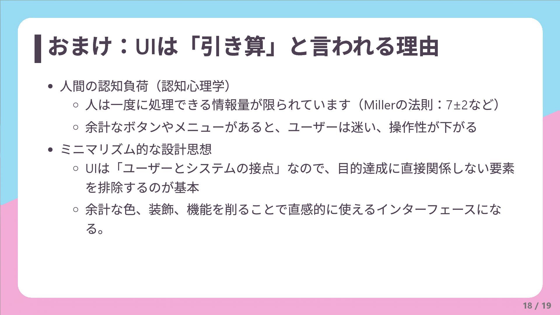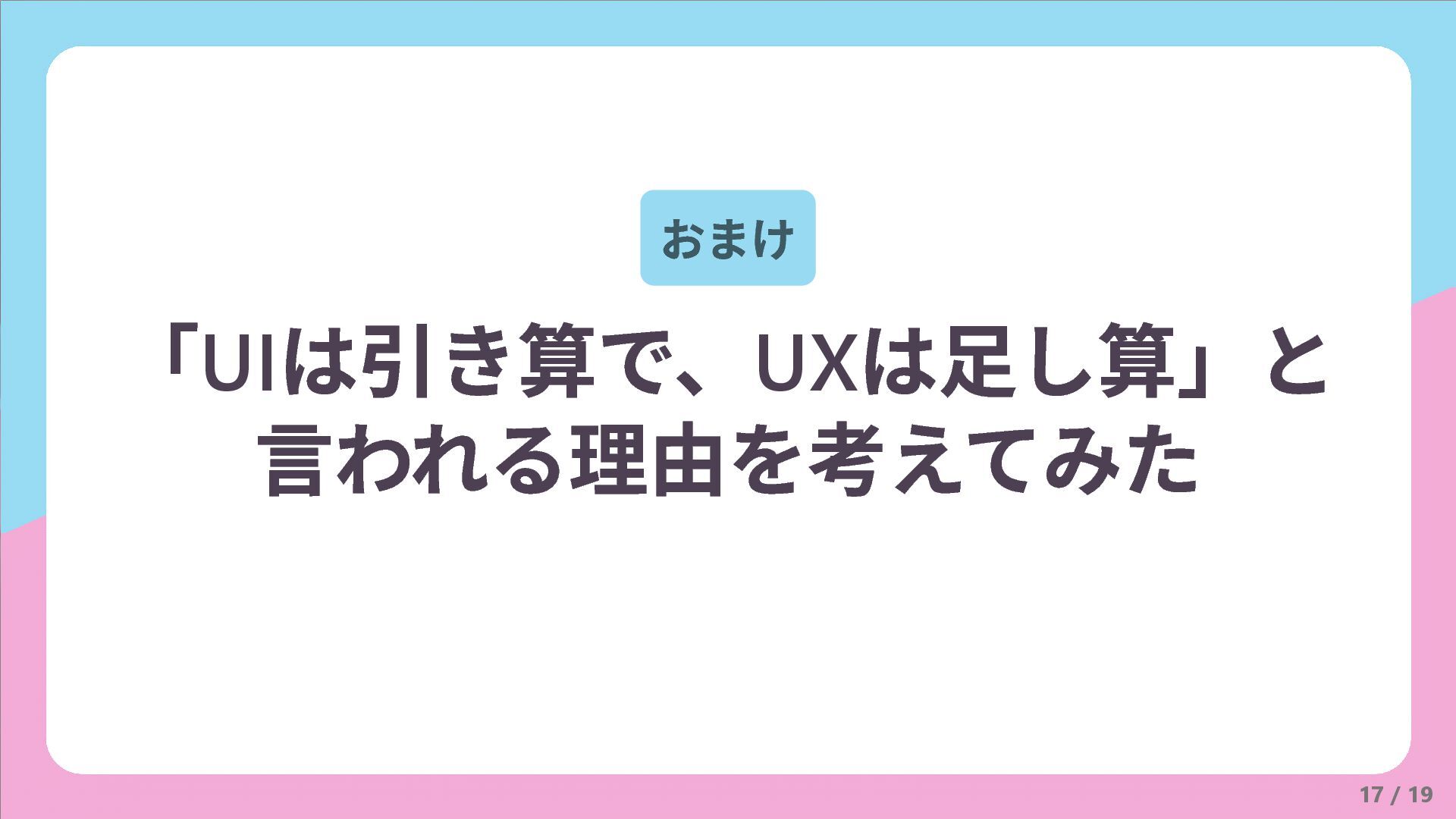 おまけ 17 / 19 「UI は引き算で、UX は足し算」と 言われる理由を考えてみた