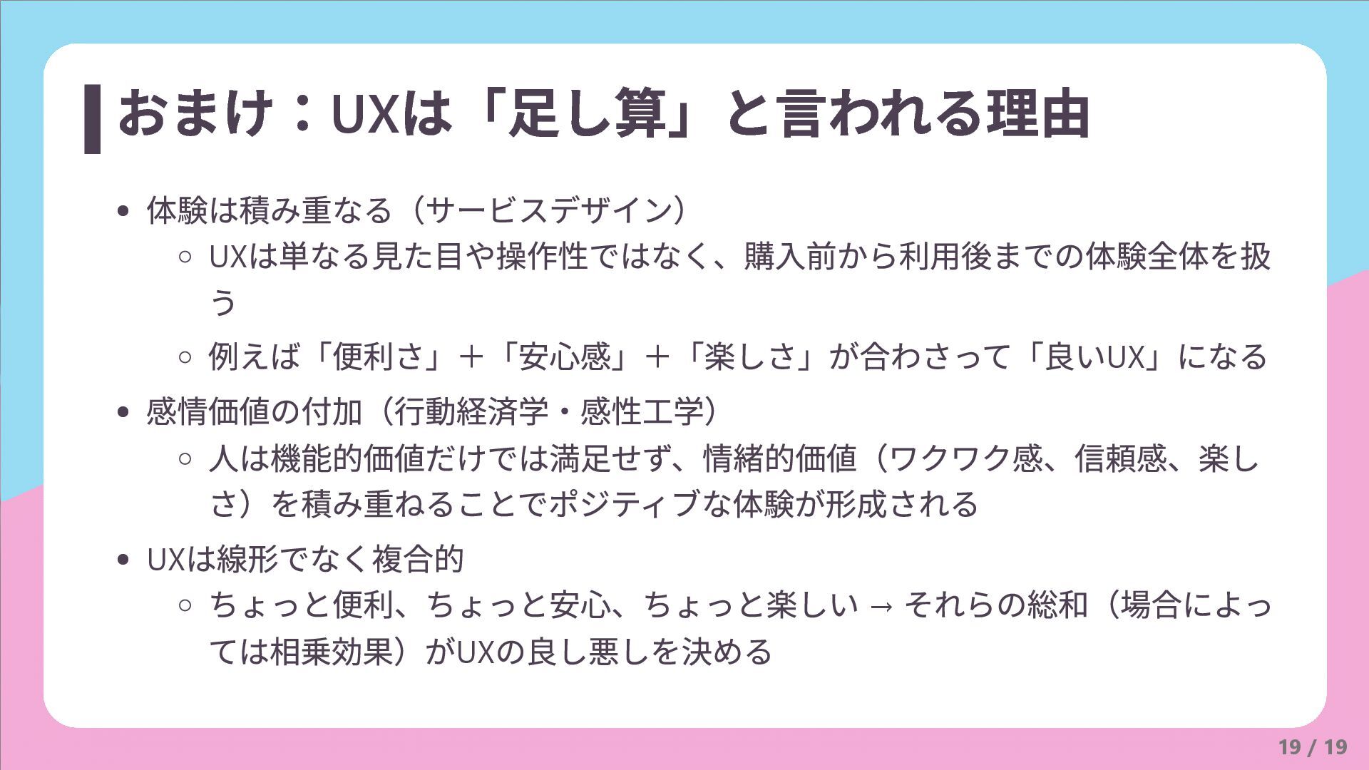 は線形でなく複合的 ちょっと便利、ちょっと安心、ちょっと楽しい → それらの総和(場合によっ ては相乗効果)がUX の良し悪しを決める 19 / 19 おまけ:UX は「足し算」と言われる理由
