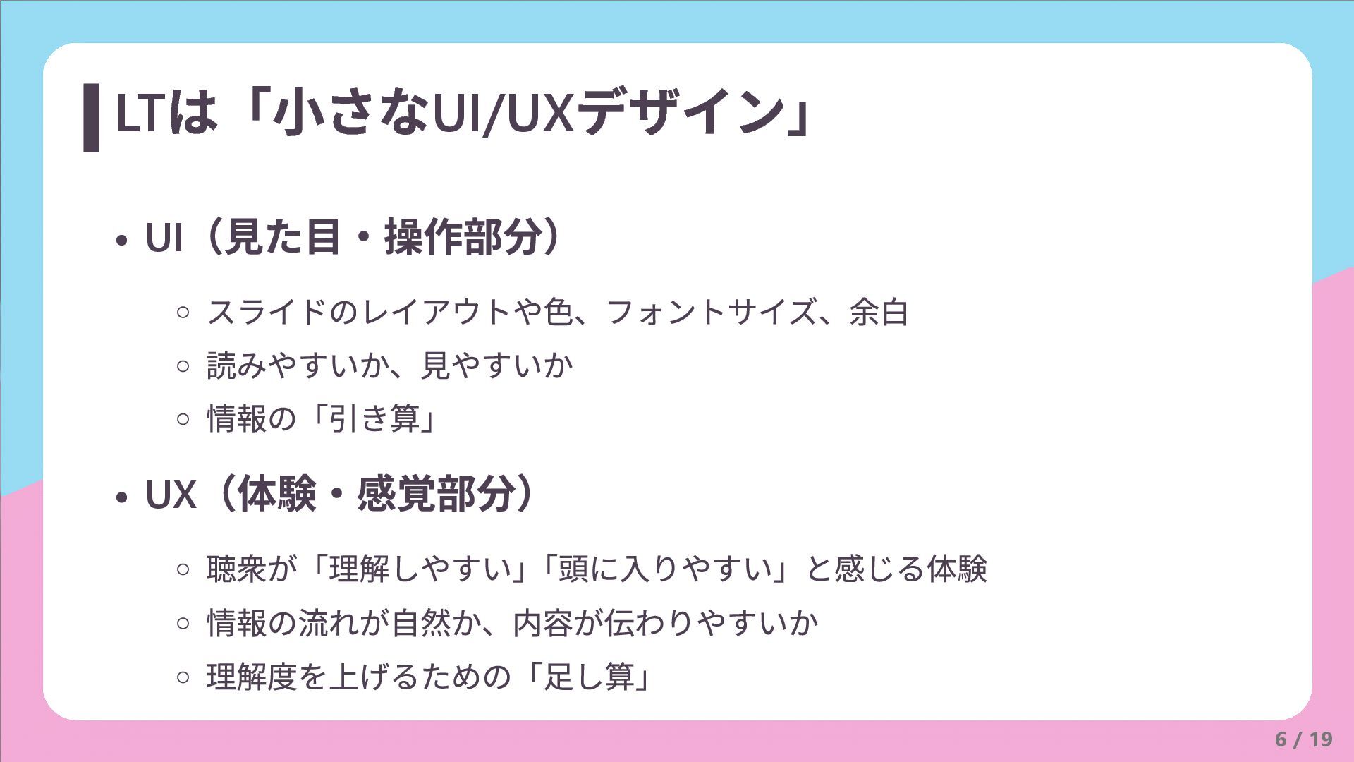 理解度を上げるための「足し算」 6 / 19 LT は「小さなUI/UX デザイン」