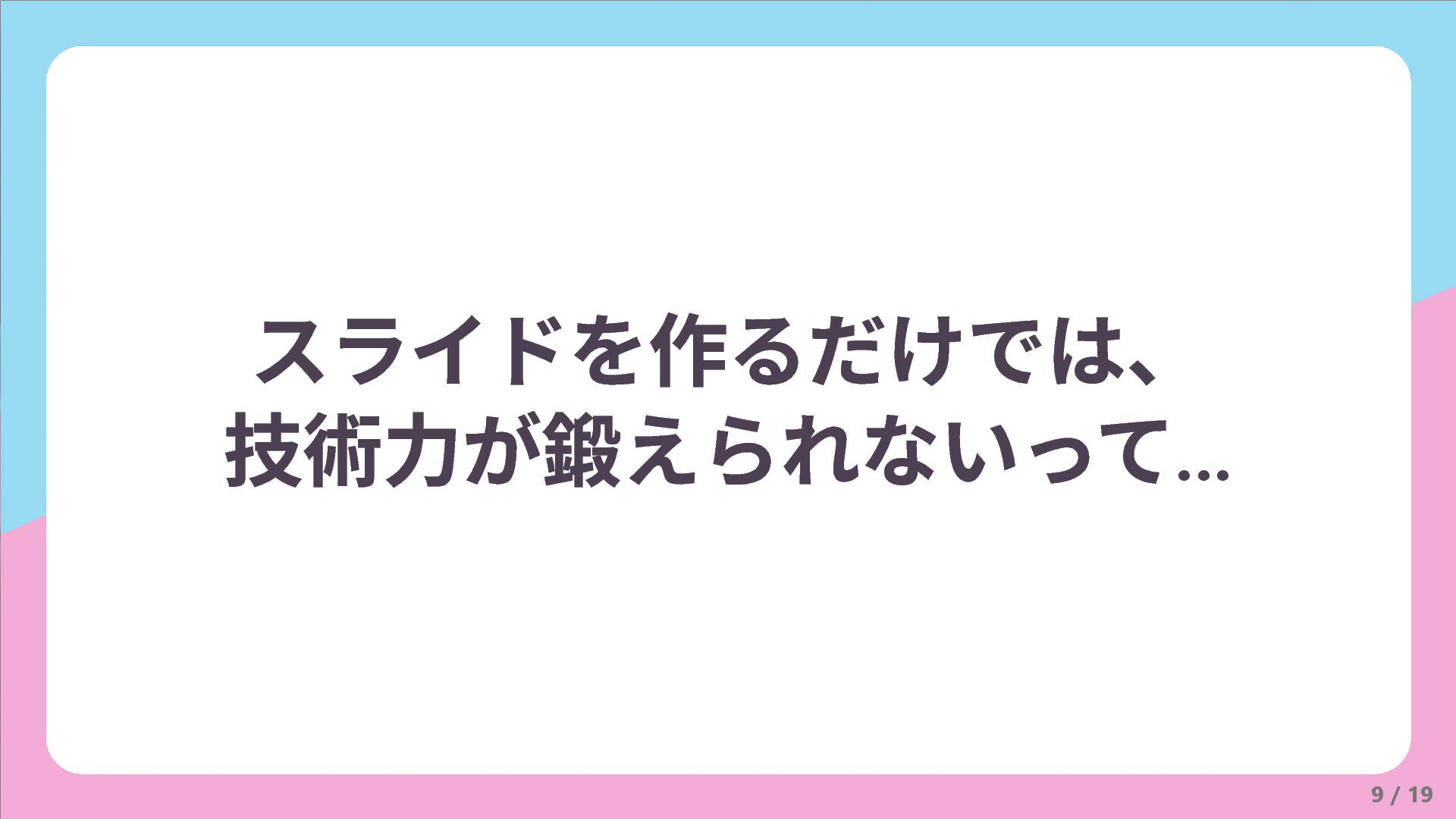 9 / 19 スライドを作るだけでは、 技術力が鍛えられないって...