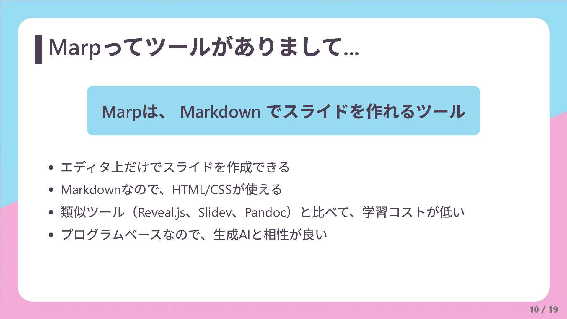 、Pandoc )と比べて、学習コストが低い プログラムベースなので、生成AI と相性が良い 10 / 19 Marp ってツールがありまして...
