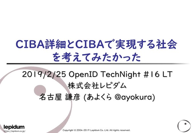 CIBA詳細とCIBAで実現する社会 を考えてみたかった 2019/2/25 OpenID TechNight #16 LT 株式会社レピダム 名古屋 謙彦 (あよくら @ayokura)