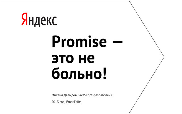 Асинхронность в JavaScript-приложениях – обычное дело. Любой обмен данными – асинхронный, что HTTP, что чтение файла, что БД. Все просто, если запрос один – callback, и все дела. Если логика сложнее, то приложение в худшем случае превращается в «Callback Pyramid of Doom» или обрастает разной магией. Promise – это подход, который выпрямляет вложенные запросы, превращает «асинхронную лапшу» в структурированный код и делает ваше приложение лучше. Вы всё еще боитесь использовать Promise? Тогда приходите на мой доклад.