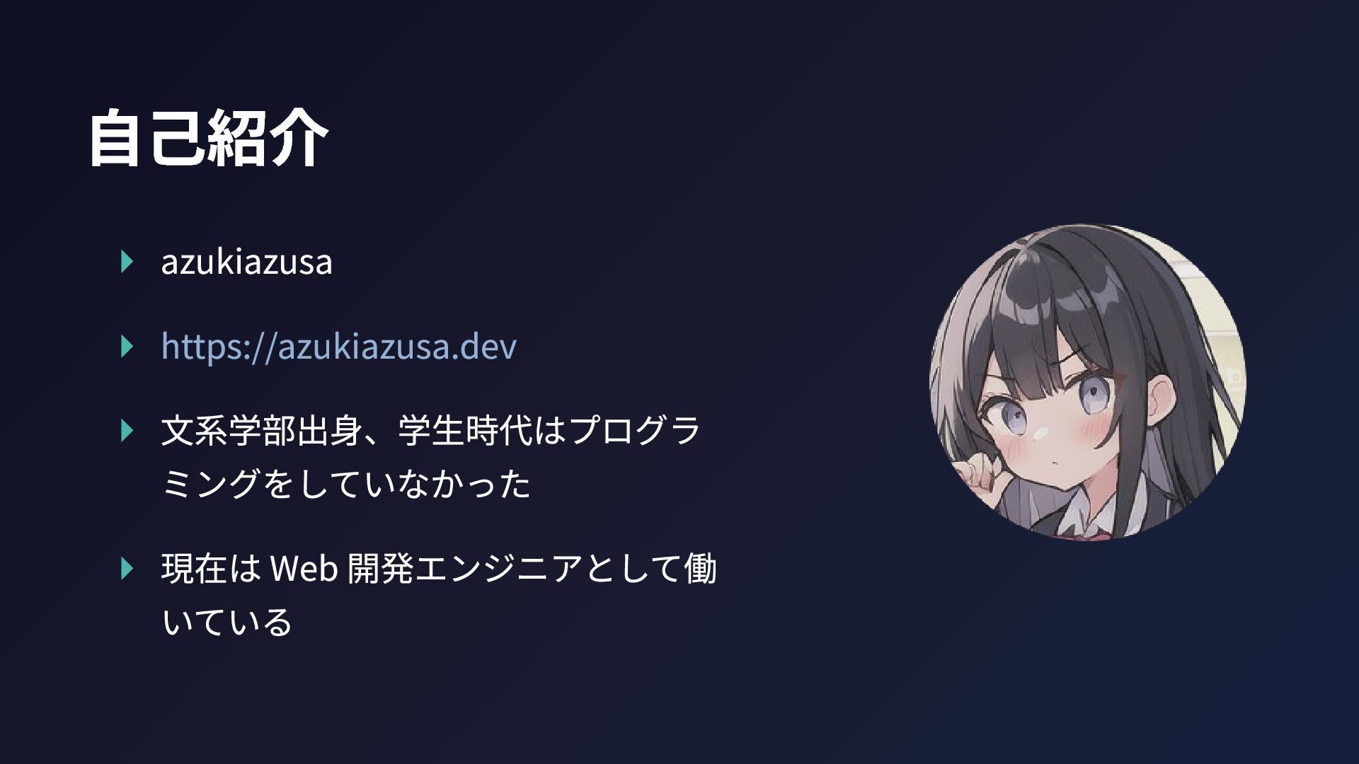 自己紹介 ▸ azukiazusa ▸ https://azukiazusa.dev ▸ 文系学部出身、学生時代はプログラ ミングをしていなかった ▸ 現在は