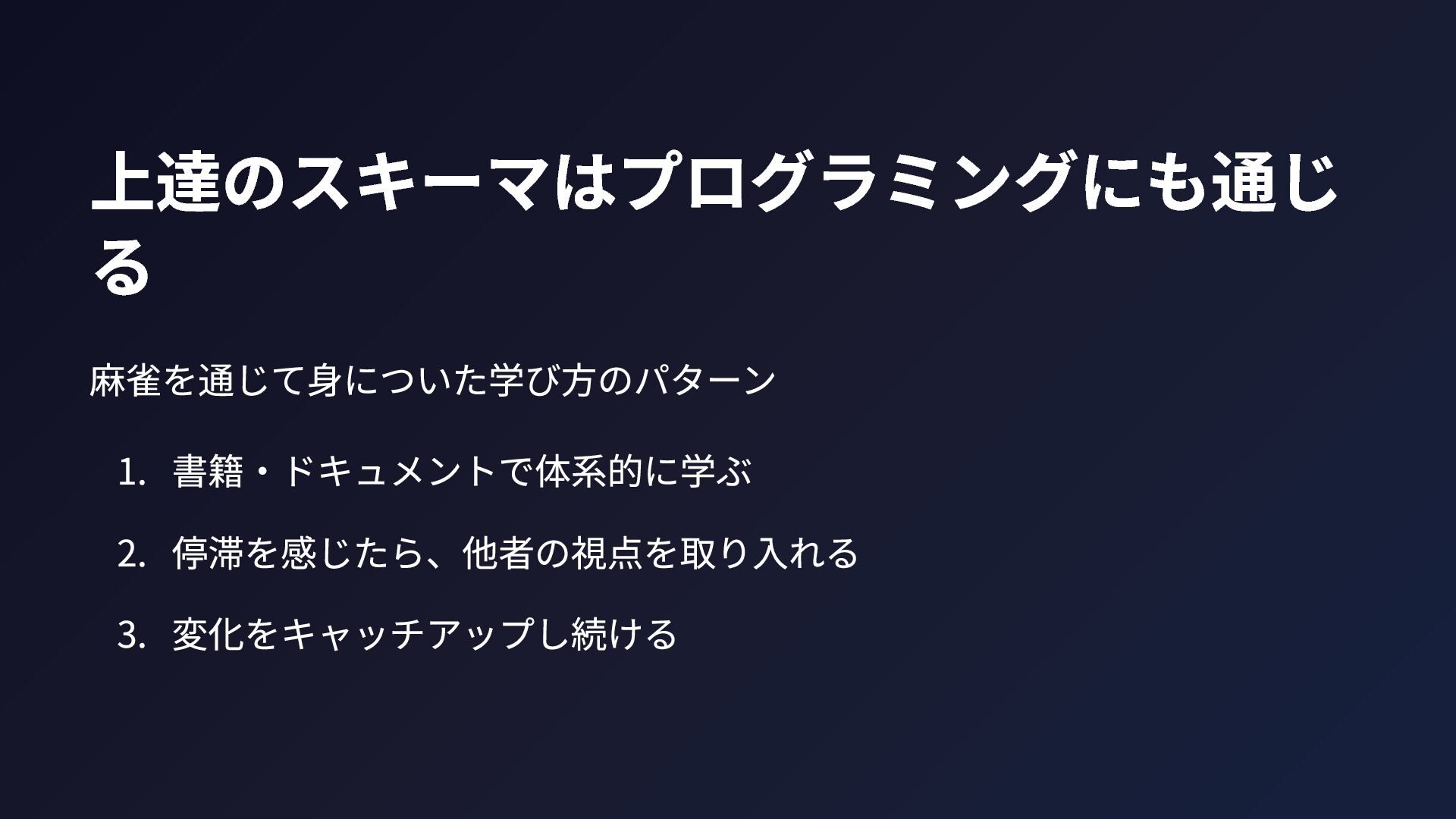 上達のスキーマはプログラミングにも通じ る 麻雀を通じて身についた学び方のパターン 1. 書籍・ドキュメントで体系的に学ぶ 2. 停滞を感じたら、他者の視点を取り入れる 3. 変化をキャッチアップし続ける