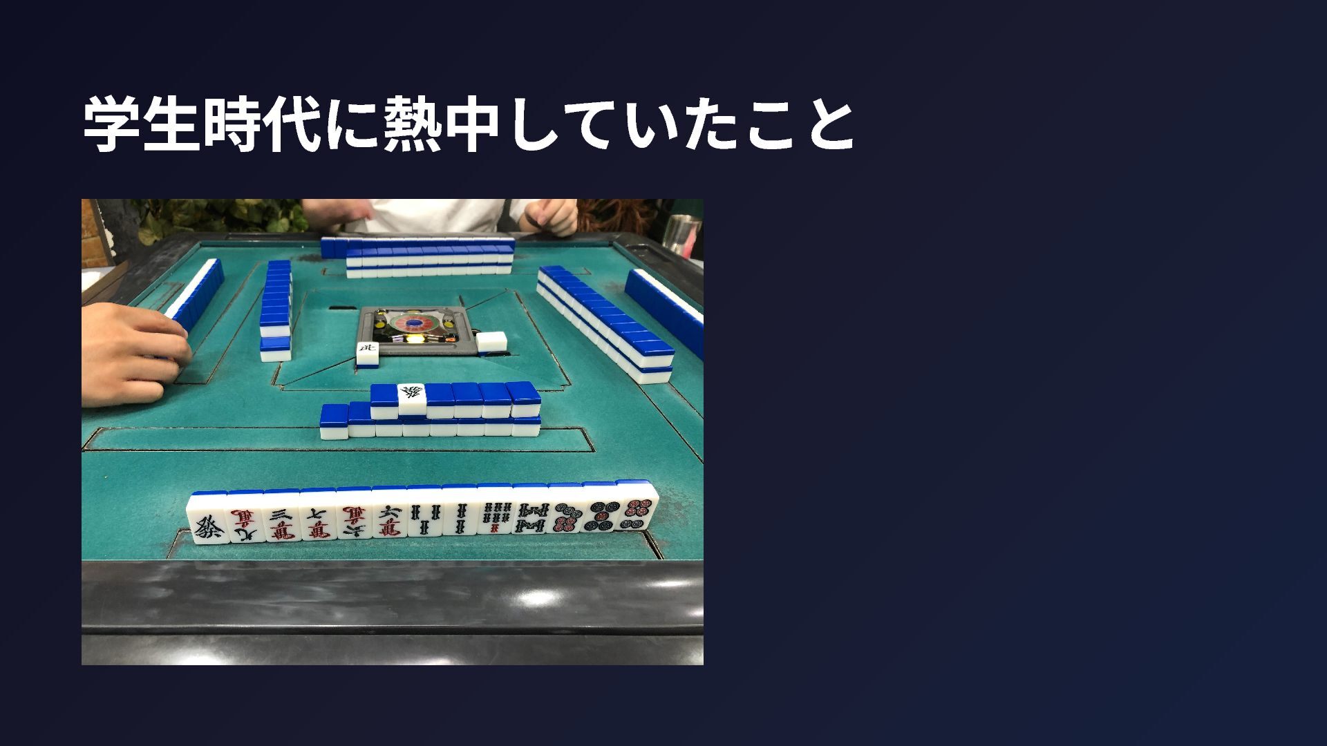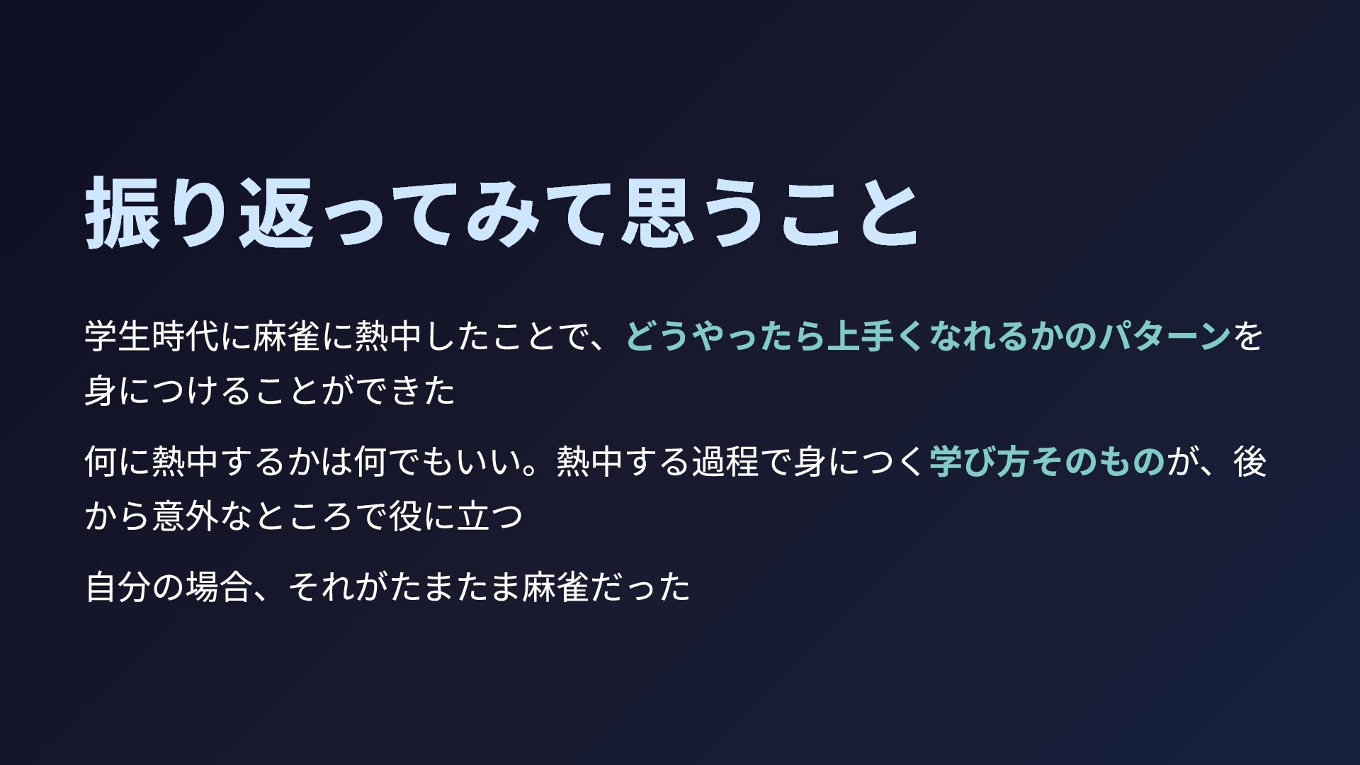 振り返ってみて思うこと 学生時代に麻雀に熱中したことで、どうやったら上手くなれるかのパターンを 身につけることができた 何に熱中するかは何でもいい。熱中する過程で身につく学び方そのものが、後 から意外なところで役に立つ 自分の場合、それがたまたま麻雀だった