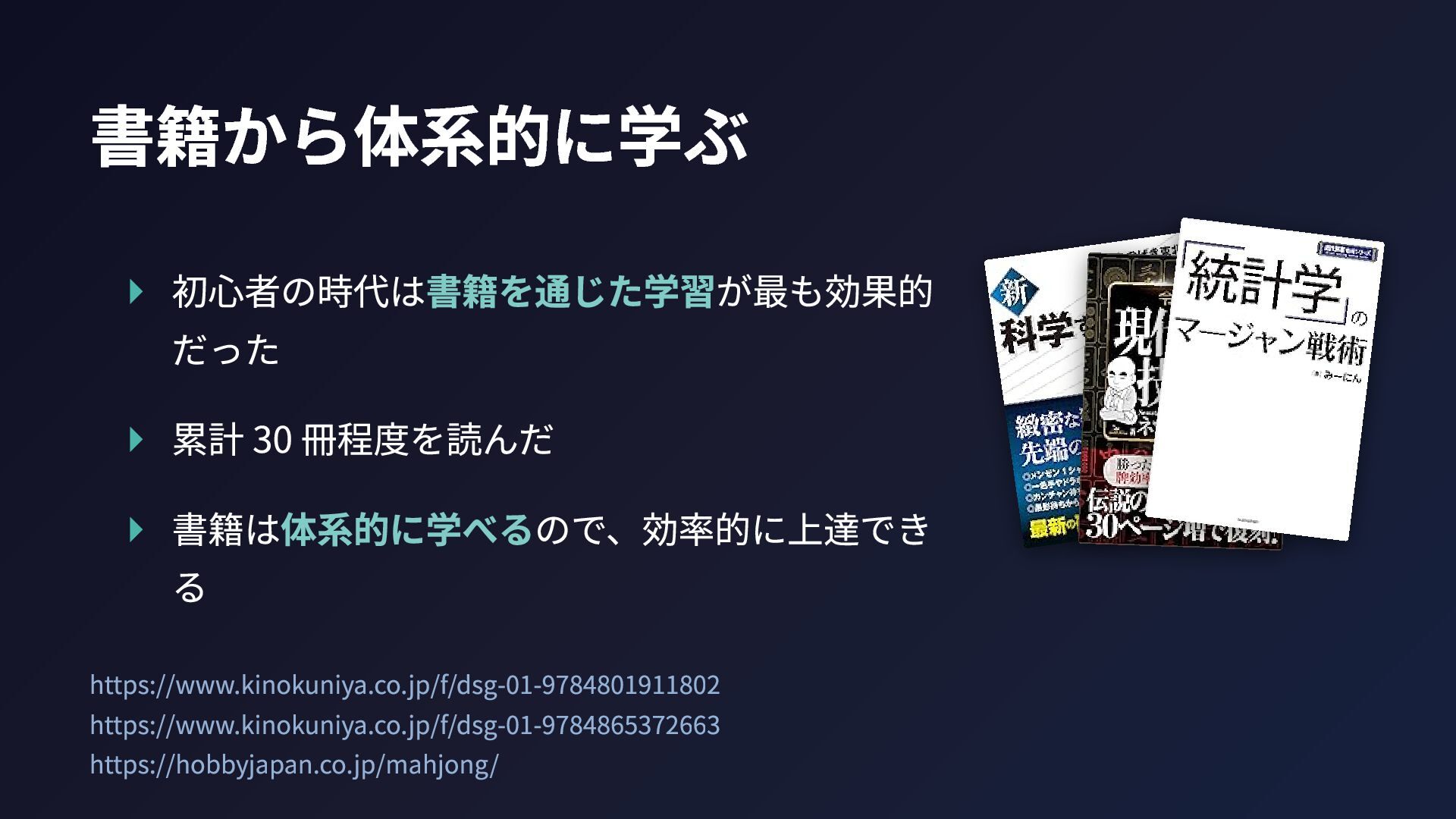 書籍から体系的に学ぶ ▸ 初心者の時代は書籍を通じた学習が最も効果的 だった ▸ 累計 30 冊程度を読んだ ▸ 書籍は体系的に学べるので、効率的に上達でき