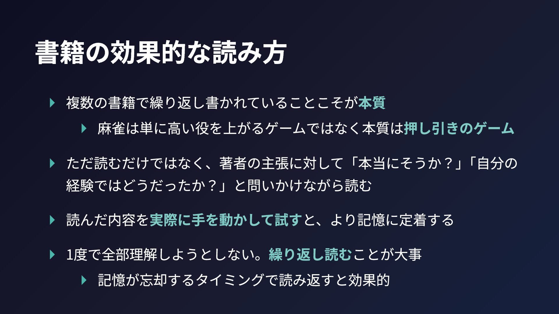 書籍の効果的な読み方 ▸ 複数の書籍で繰り返し書かれていることこそが本質 ▸ 麻雀は単に高い役を上がるゲームではなく本質は押し引きのゲーム ▸ ただ読むだけではなく、著者の主張に対して「本当にそうか?」 「自分の 経験ではどうだったか?」と問いかけながら読む ▸