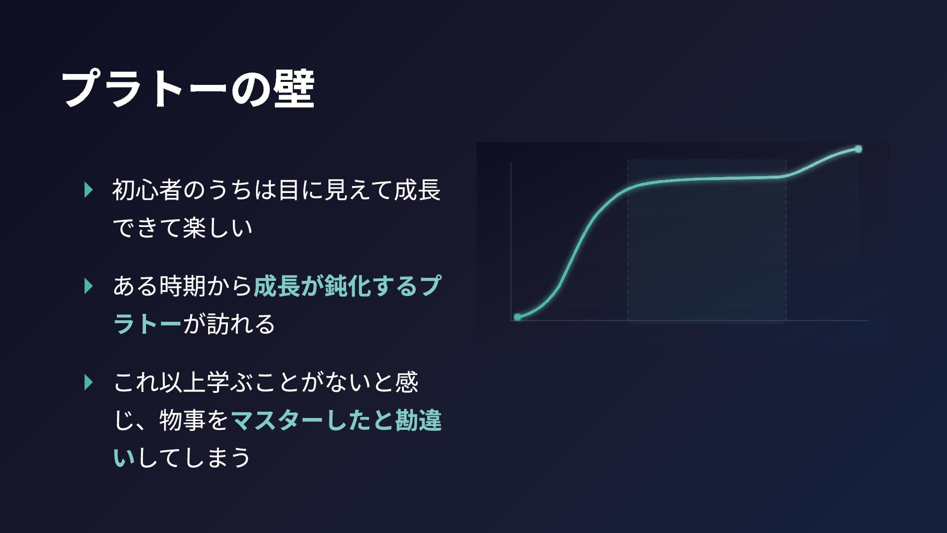 プラトーの壁 ▸ 初心者のうちは目に見えて成長 できて楽しい ▸ ある時期から成長が鈍化するプ ラトーが訪れる ▸ これ以上学ぶことがないと感 じ、物事をマスターしたと勘違