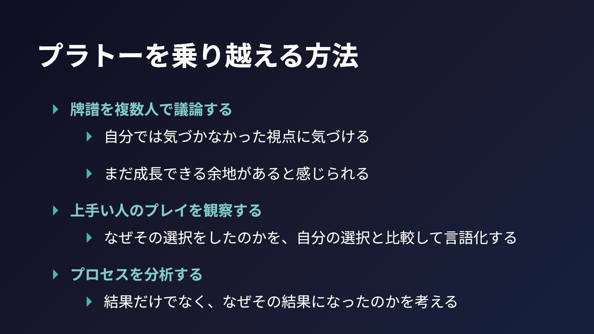 プラトーを乗り越える方法 ▸ 牌譜を複数人で議論する ▸ 自分では気づかなかった視点に気づける ▸ まだ成長できる余地があると感じられる ▸ 上手い人のプレイを観察する ▸
