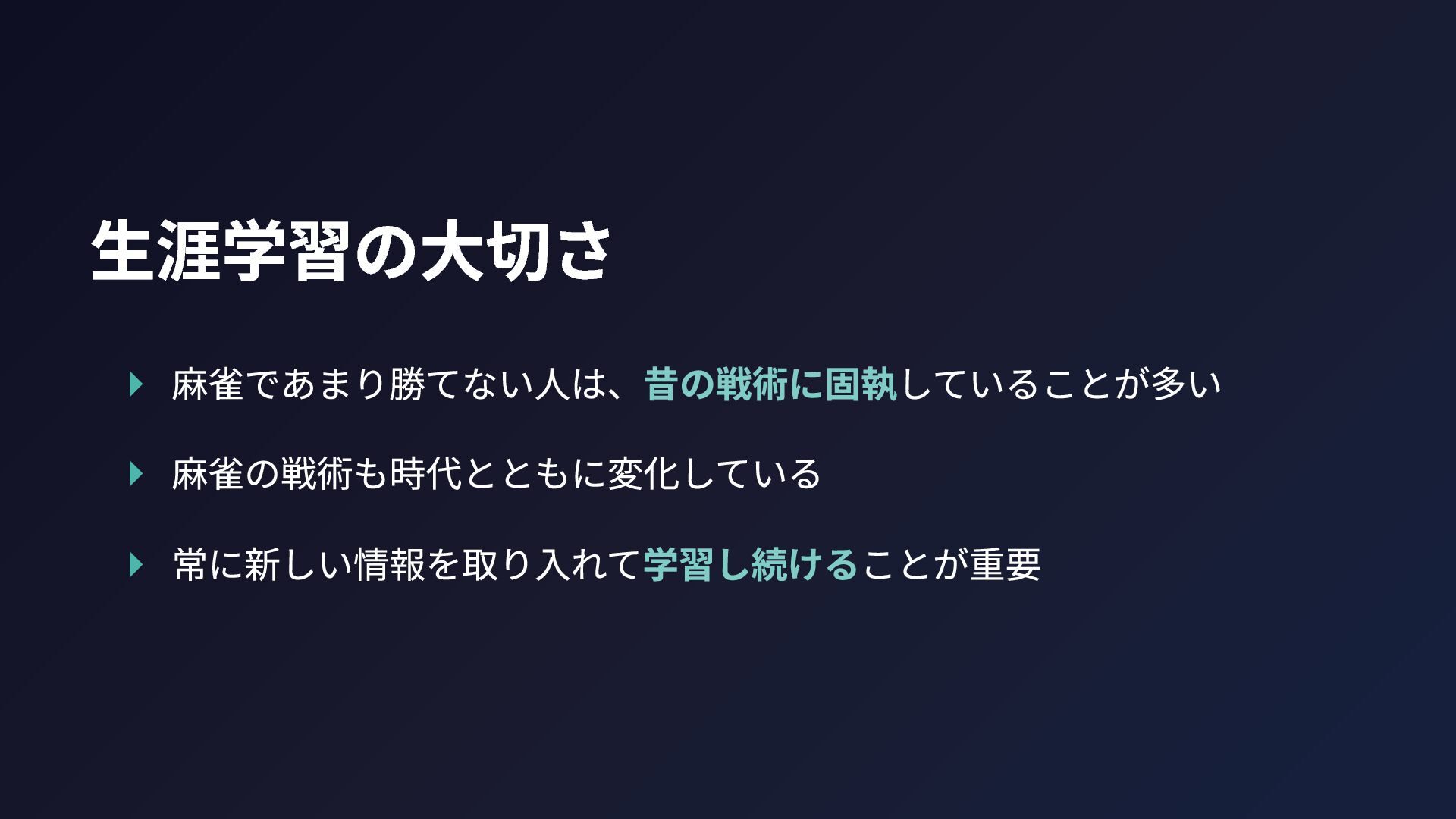 生涯学習の大切さ ▸ 麻雀であまり勝てない人は、昔の戦術に固執していることが多い ▸ 麻雀の戦術も時代とともに変化している ▸ 常に新しい情報を取り入れて学習し続けることが重要
