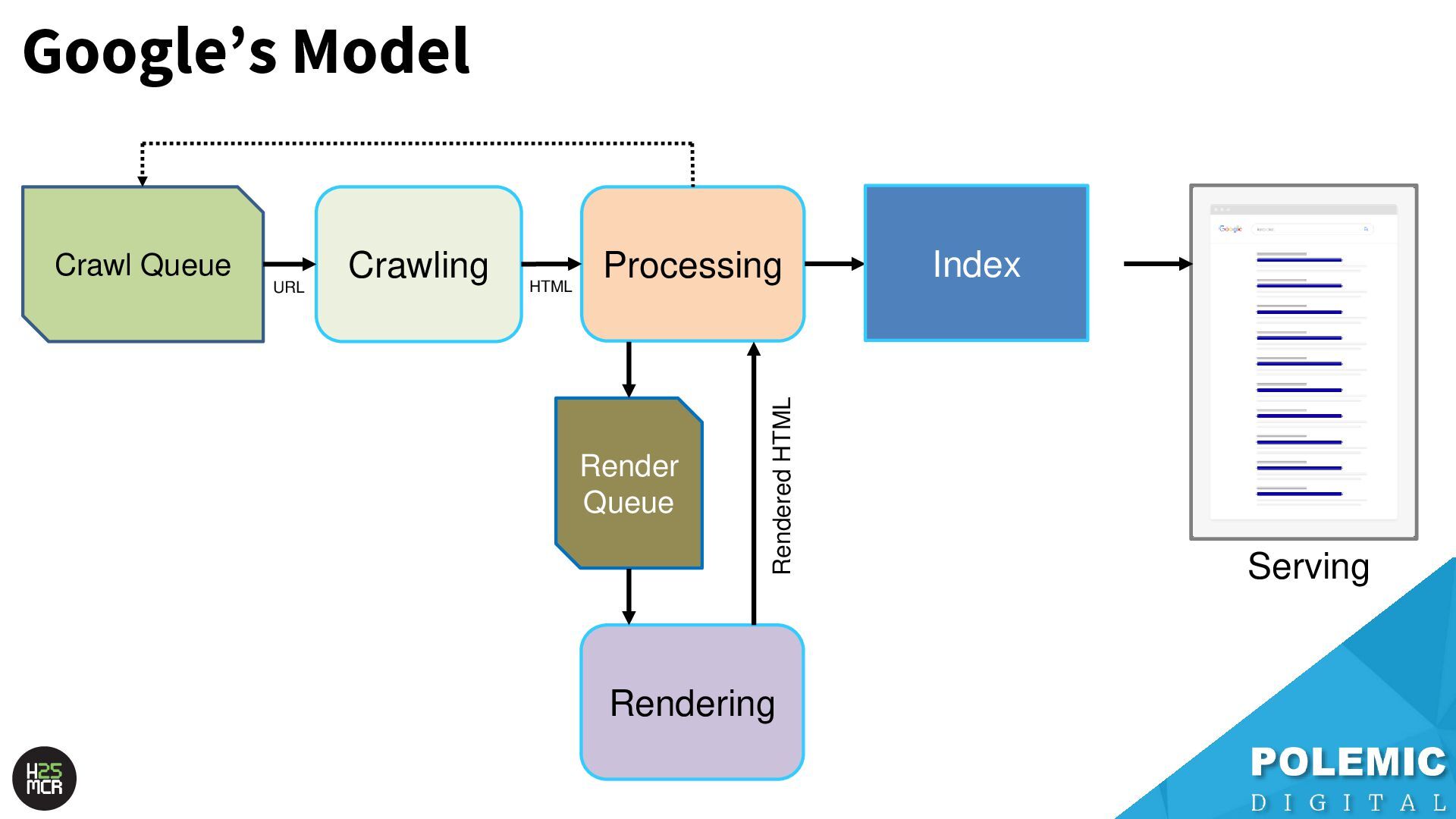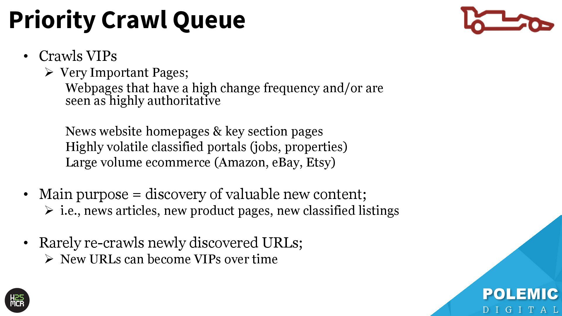 of the heavy lifting • Less frantic; ➢ More time for crawl selection, de-duplication, sanitisation of the crawl queue • Recrawls URLs first crawled by the Priority crawl queue; ➢ Checks for changes ➢ Updates relevant signals for next crawl prioritisation