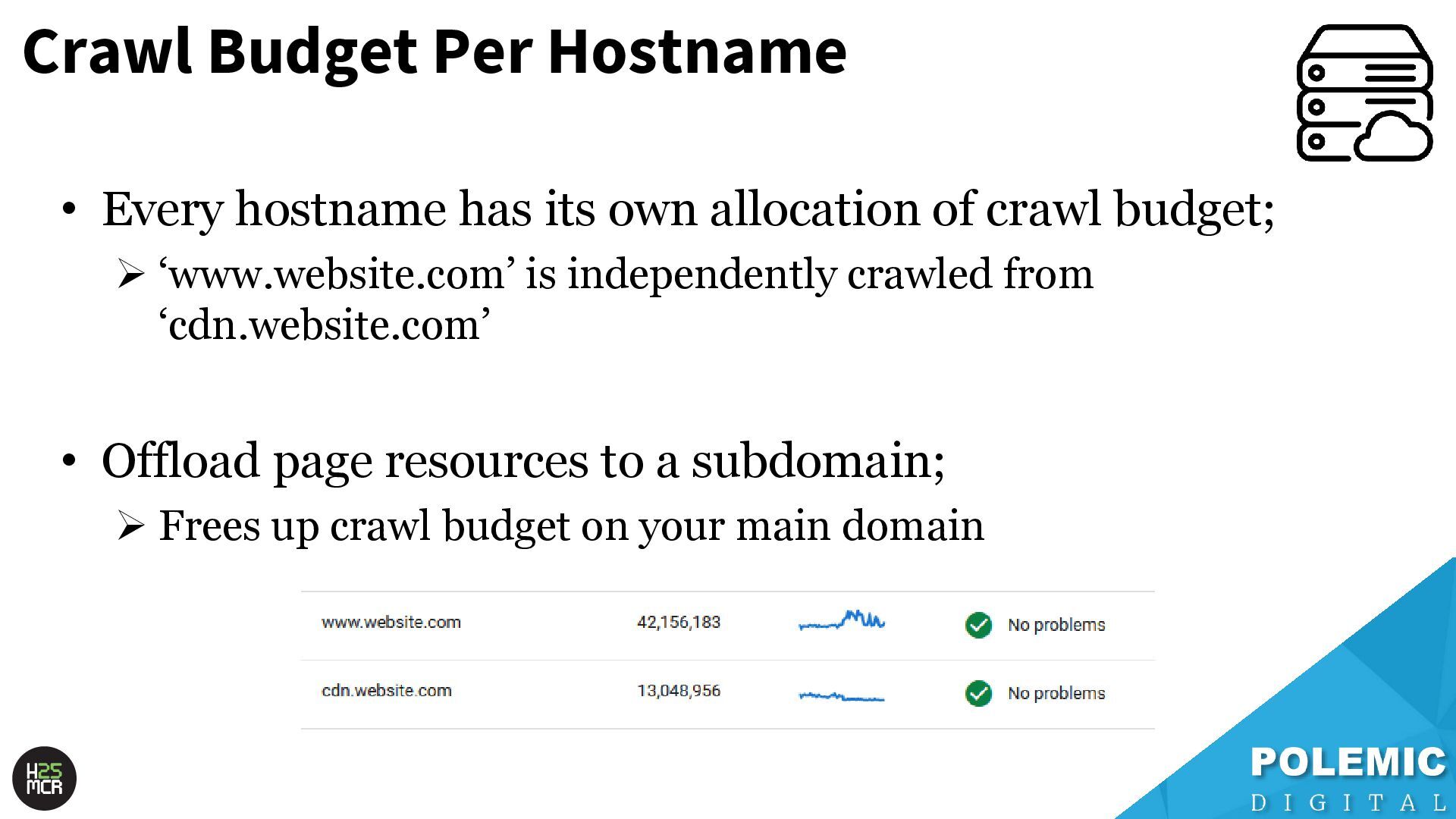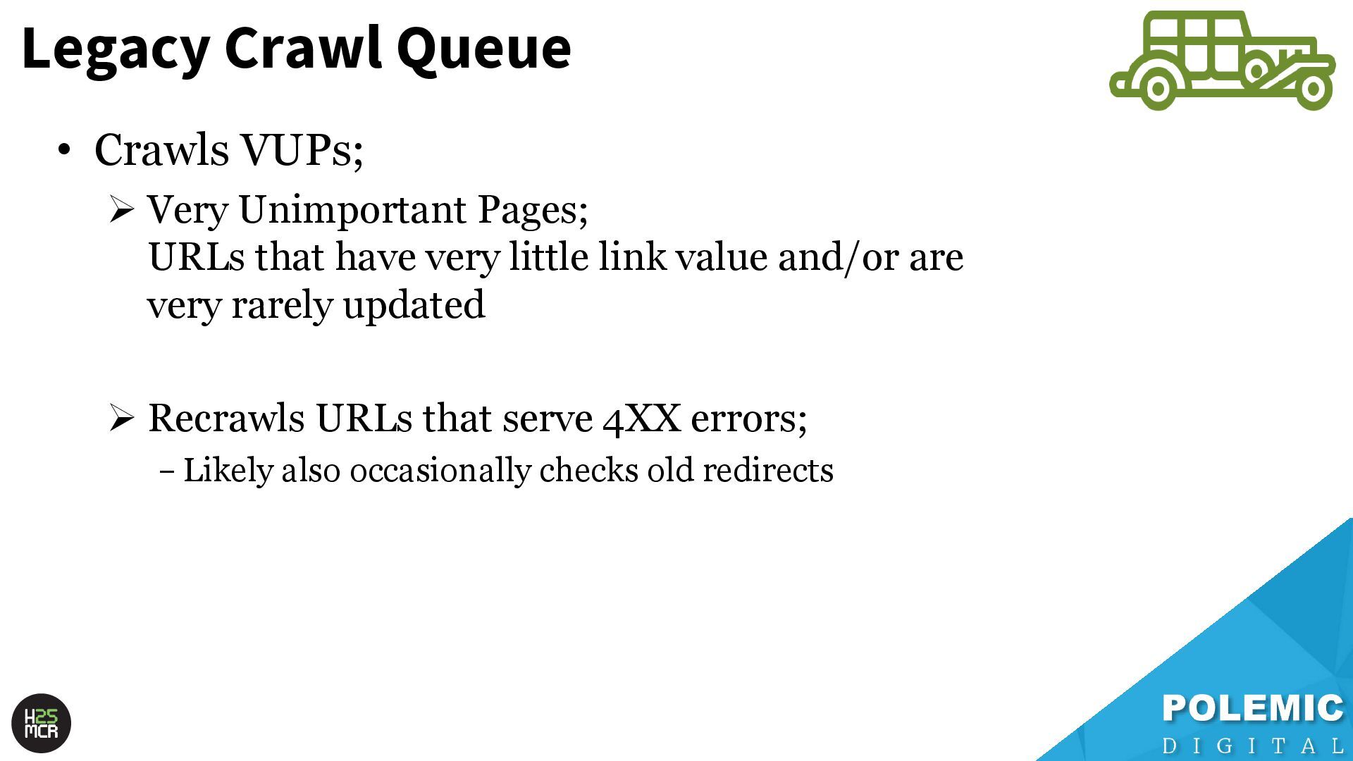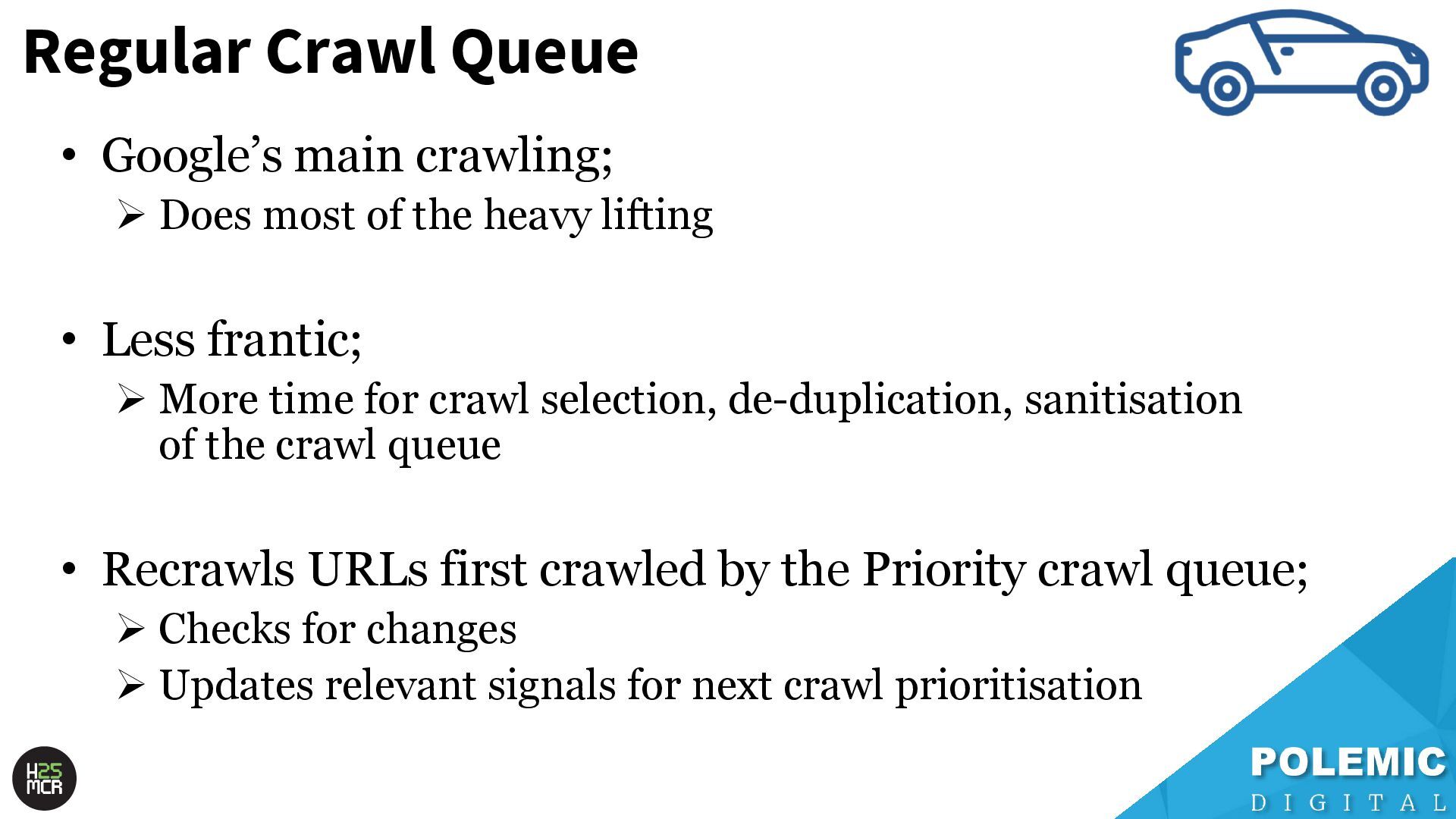 Slides from my May 2025 talk at Hive MCR in Manchester. I spoke about the technical SEO foundations of Googlebot crawling, some theories on different levels of crawl queues, and tips on maximising crawl efficiency.