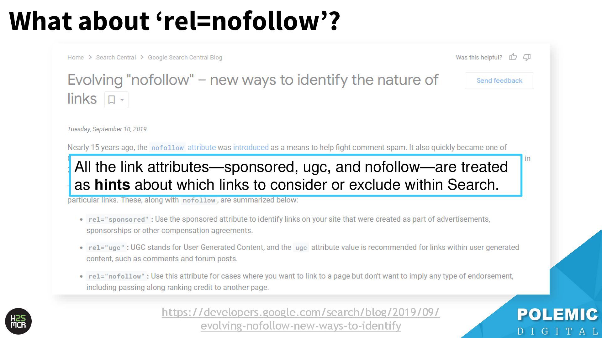 treated as hints about which links to consider or exclude within Search. https://developers.google.com/search/blog/2019/09/ evolving-nofollow-new-ways-to-identify