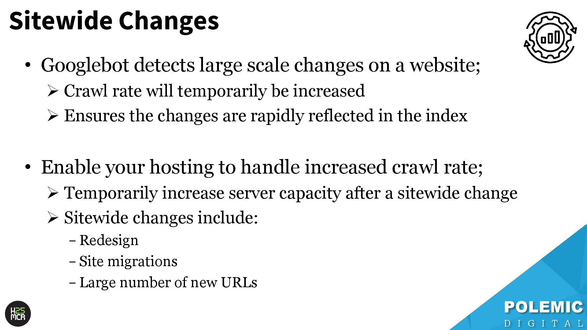 website; ➢ Crawl rate will temporarily be increased ➢ Ensures the changes are rapidly reflected in the index • Enable your hosting to handle increased crawl rate; ➢ Temporarily increase server capacity after a sitewide change ➢ Sitewide changes include: -Redesign -Site migrations -Large number of new URLs