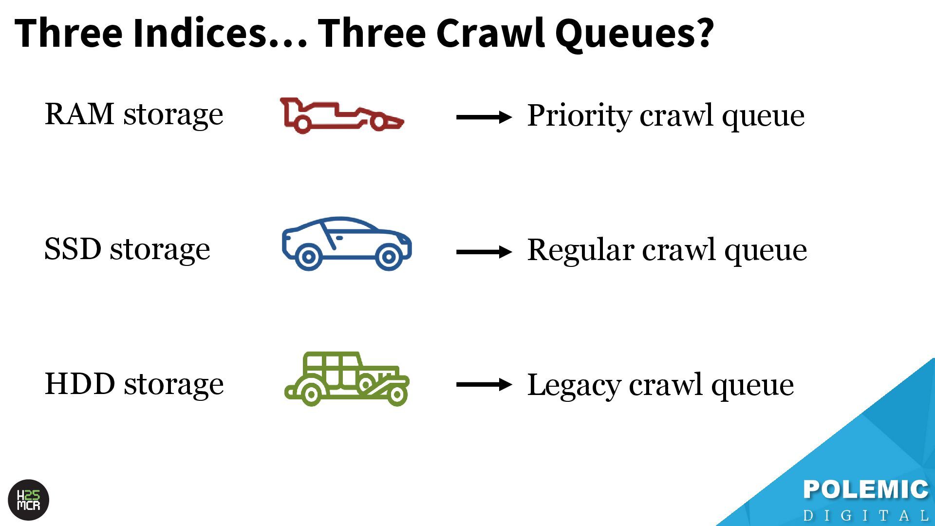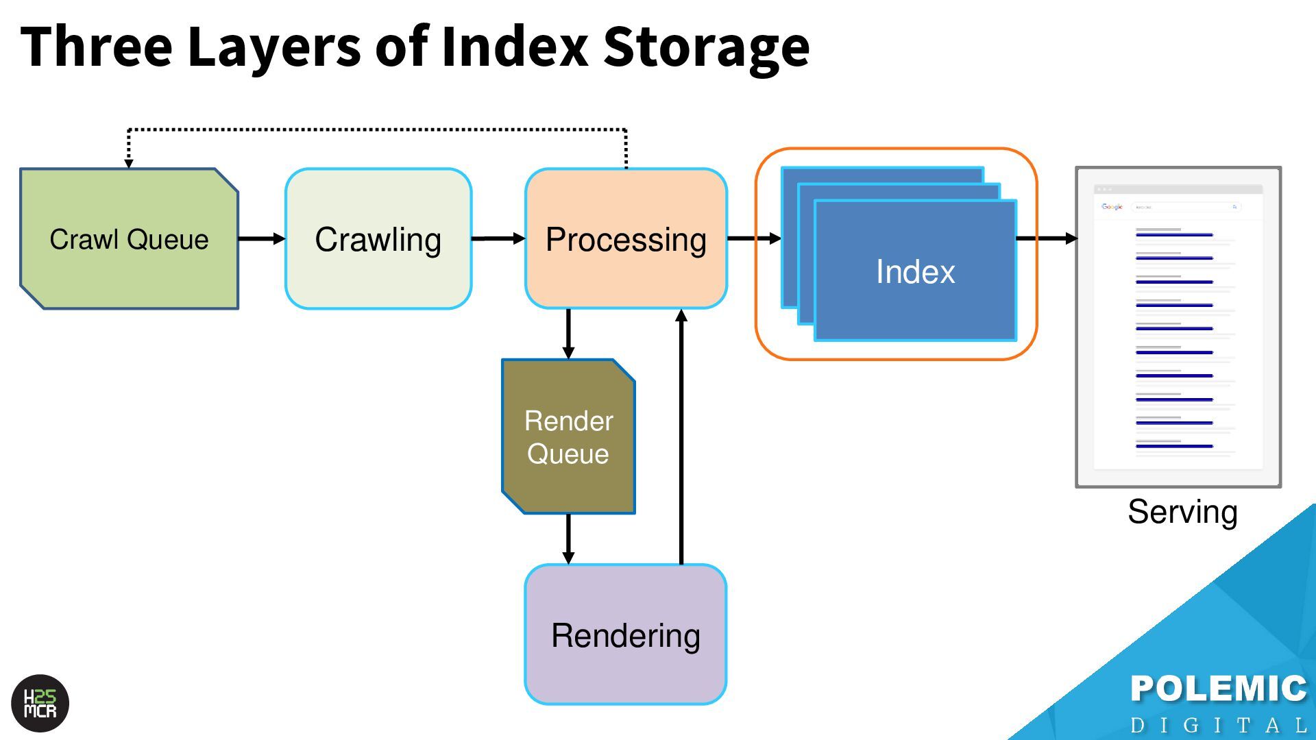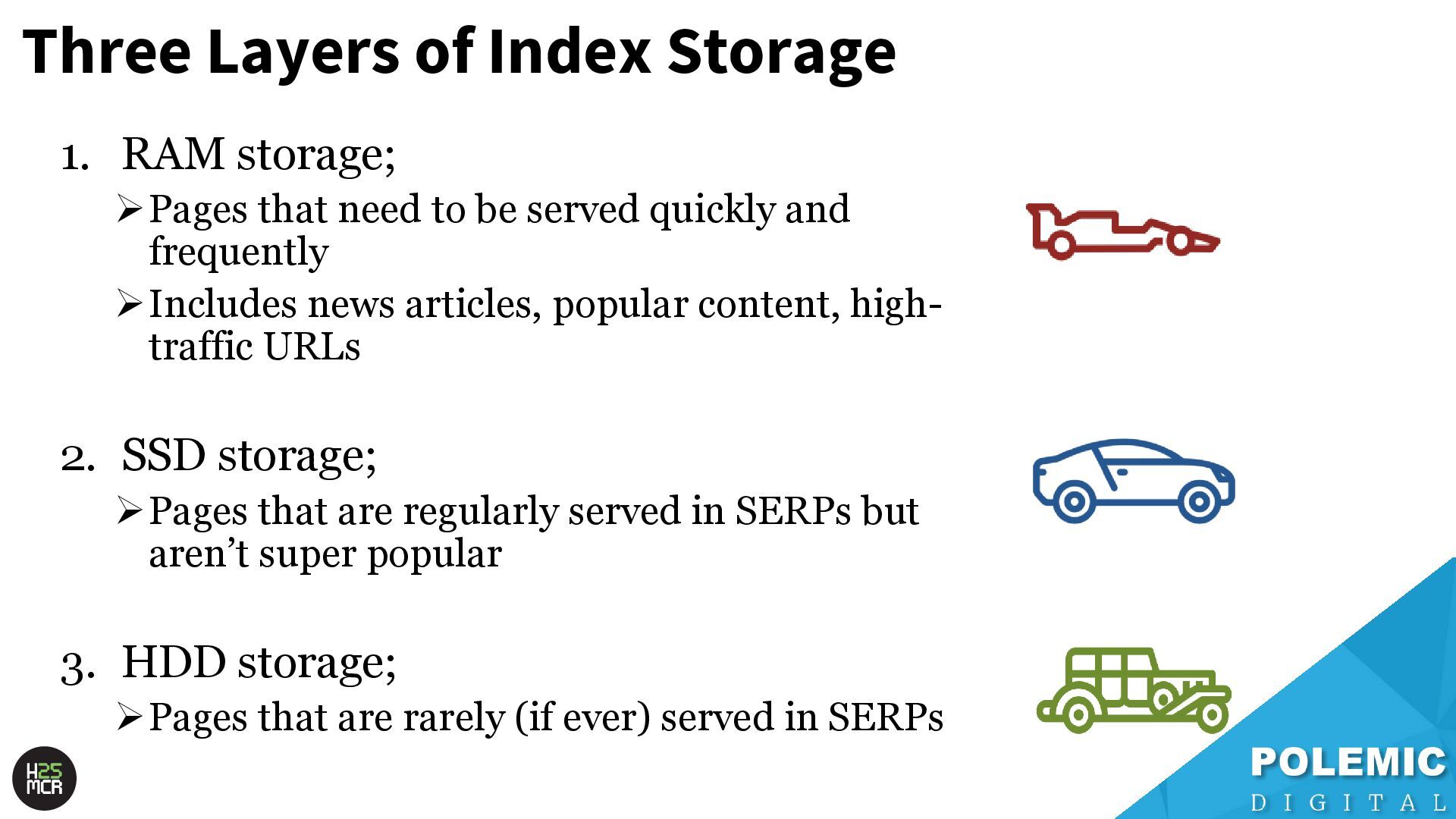 need to be served quickly and frequently ➢Includes news articles, popular content, high- traffic URLs 2. SSD storage; ➢Pages that are regularly served in SERPs but aren’t super popular 3. HDD storage; ➢Pages that are rarely (if ever) served in SERPs