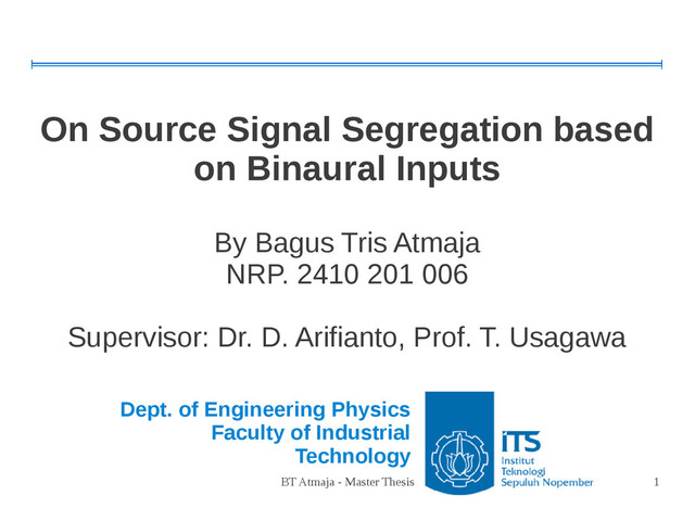 based on Binaural Inputs By Bagus Tris Atmaja NRP. 2410 201 006 Supervisor: Dr. D. Arifianto, Prof. T. Usagawa Dept. of Engineering Physics Faculty of Industrial Technology