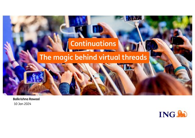 a representation of the current state of the program or Ø ‘the rest of the computation’ Ø It allows us to pause execution of a program (or part thereof) and resume it later. Ø WARNING: Continuation API in Java is not supposed to be used directly by application developers. For now, it is only used internally to implement virtual threads.