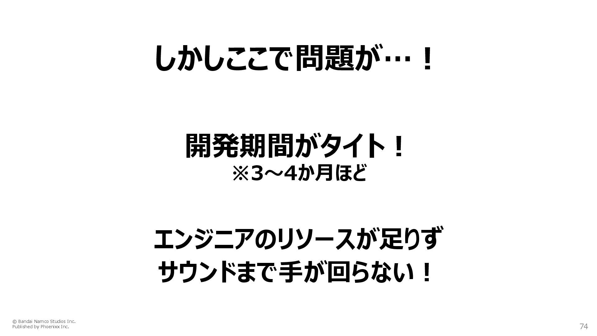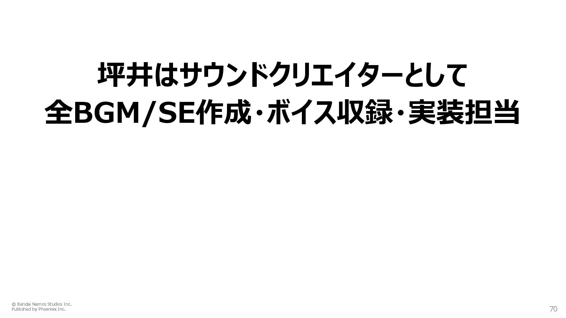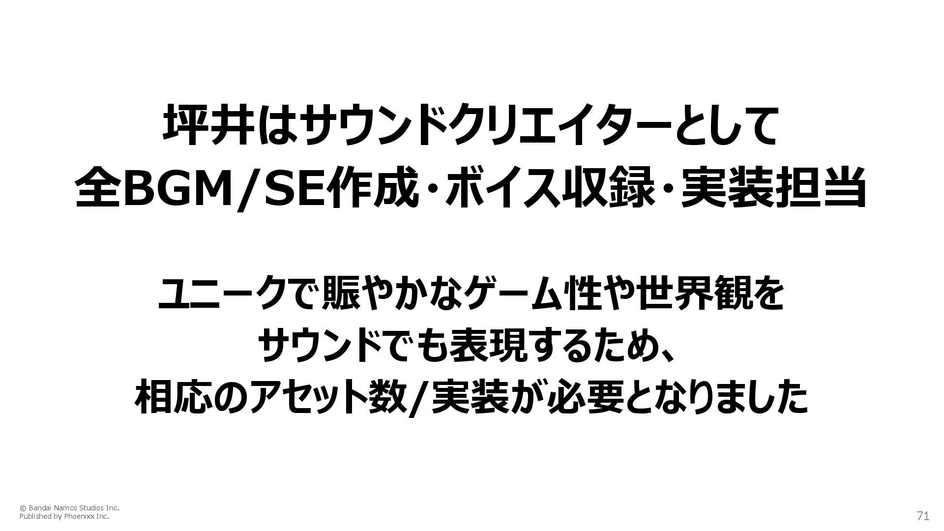 サウンドに関しては演出設計から制作、実装に至るまでの全工程を一人で担当しました。その中で避けて通れないのは膨大なサウンド物量との戦いでした。