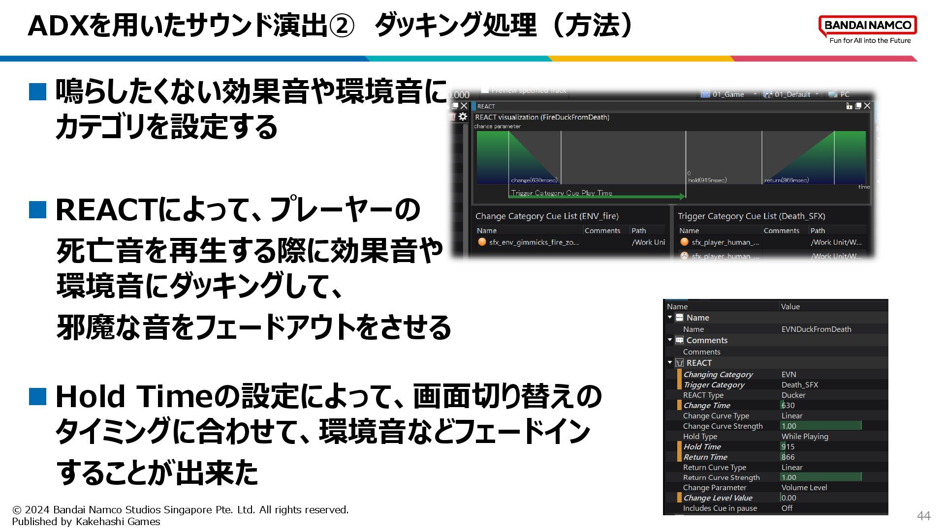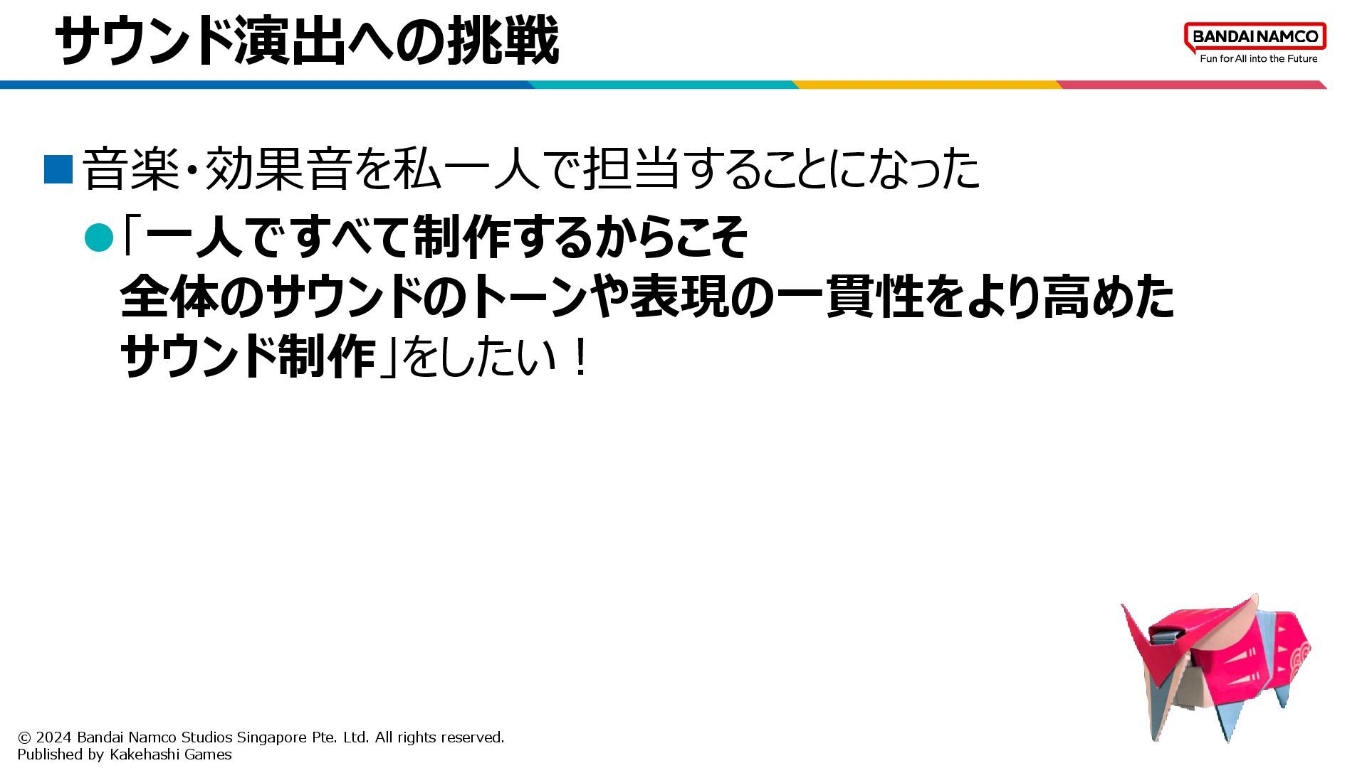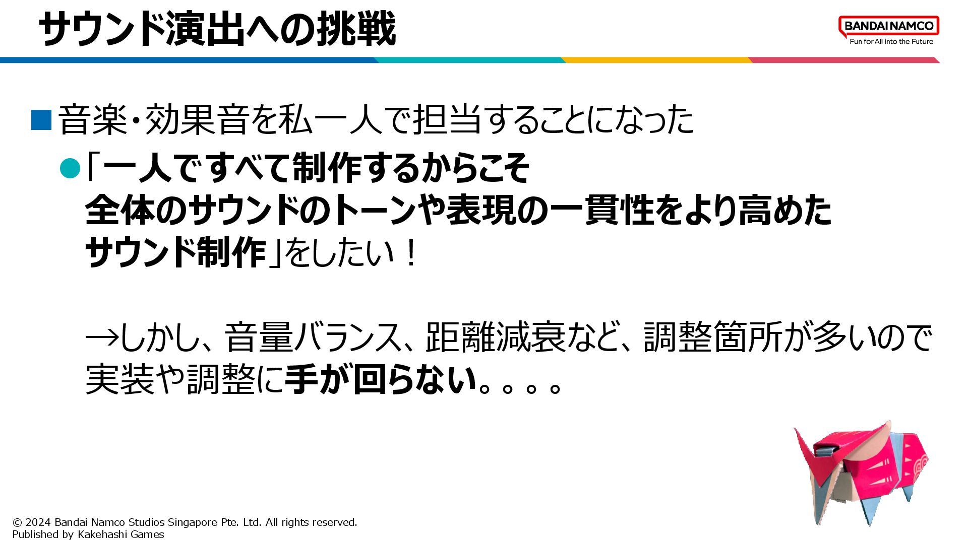 サウンドに関しては演出設計から制作、実装に至るまでの全工程を一人で担当しました。その中で避けて通れないのは膨大なサウンド物量との戦いでした。