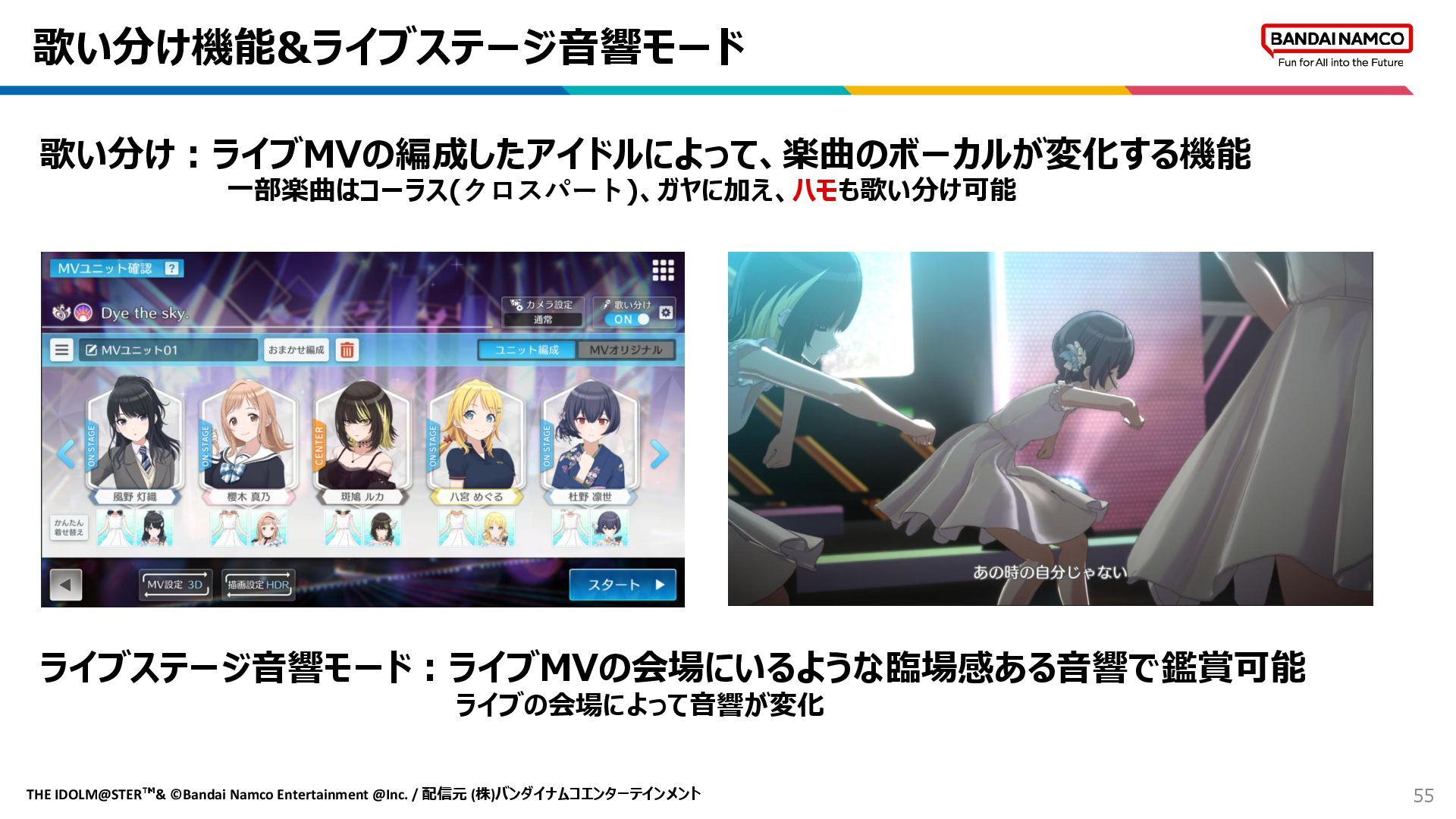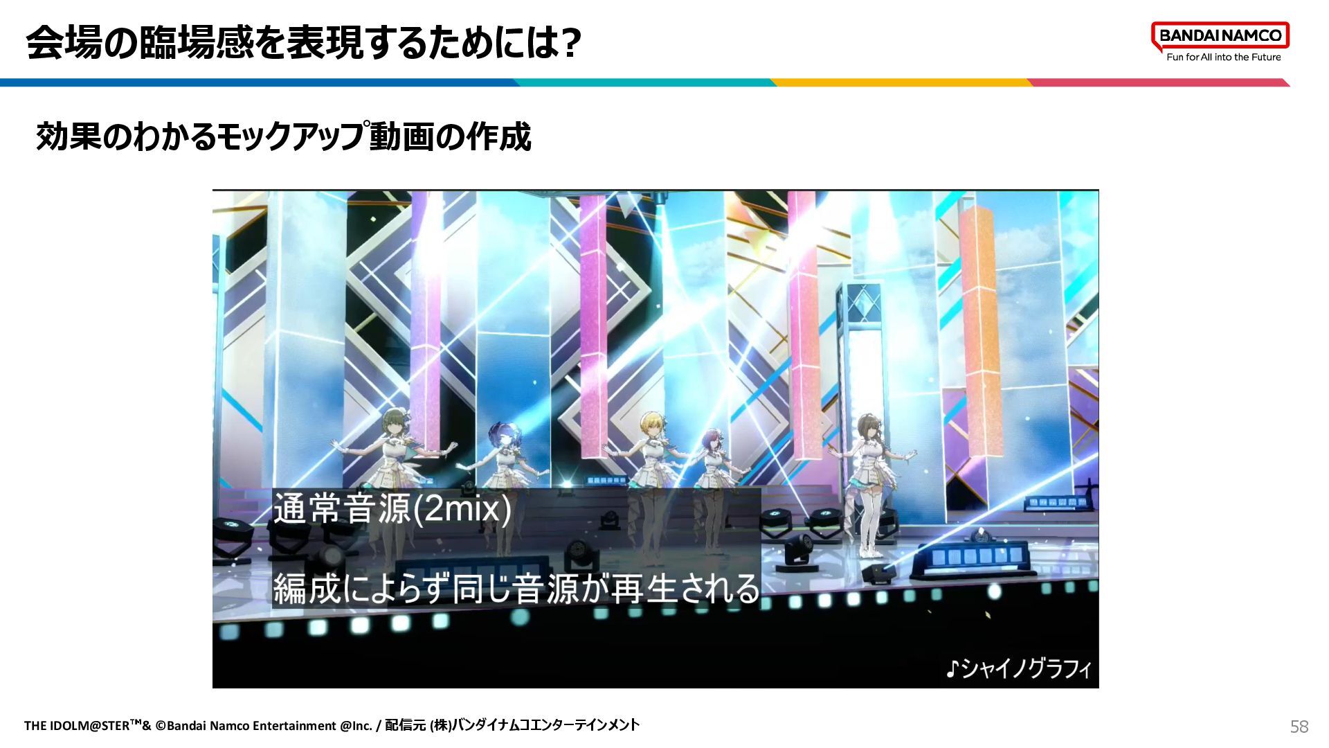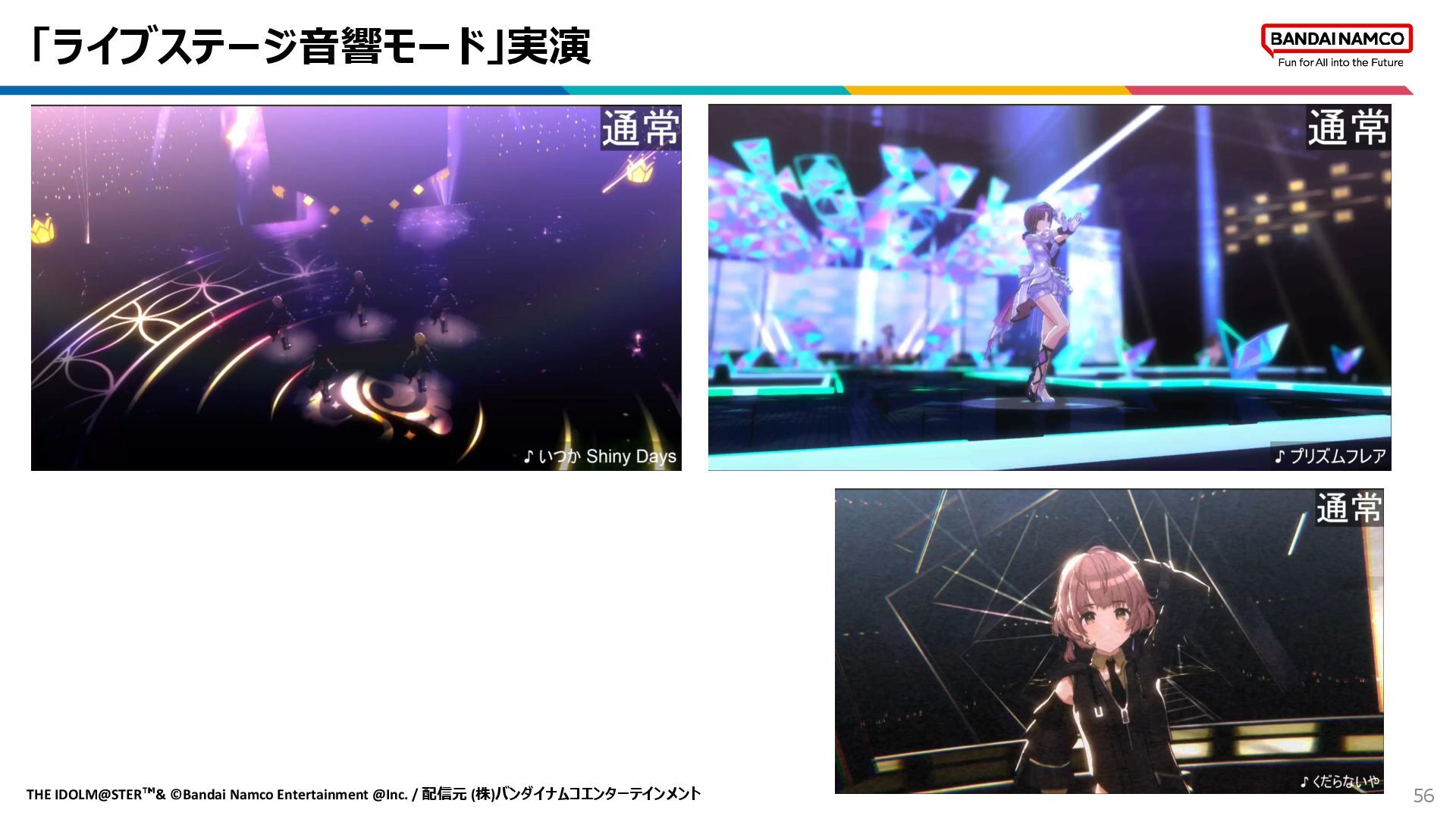 「シャニソン」のMV(ライブシーン)では、まるで現地のライブ会場にいるかのような没入感を高めるサウンド演出「ライブステージ音響モード」を搭載しています。
