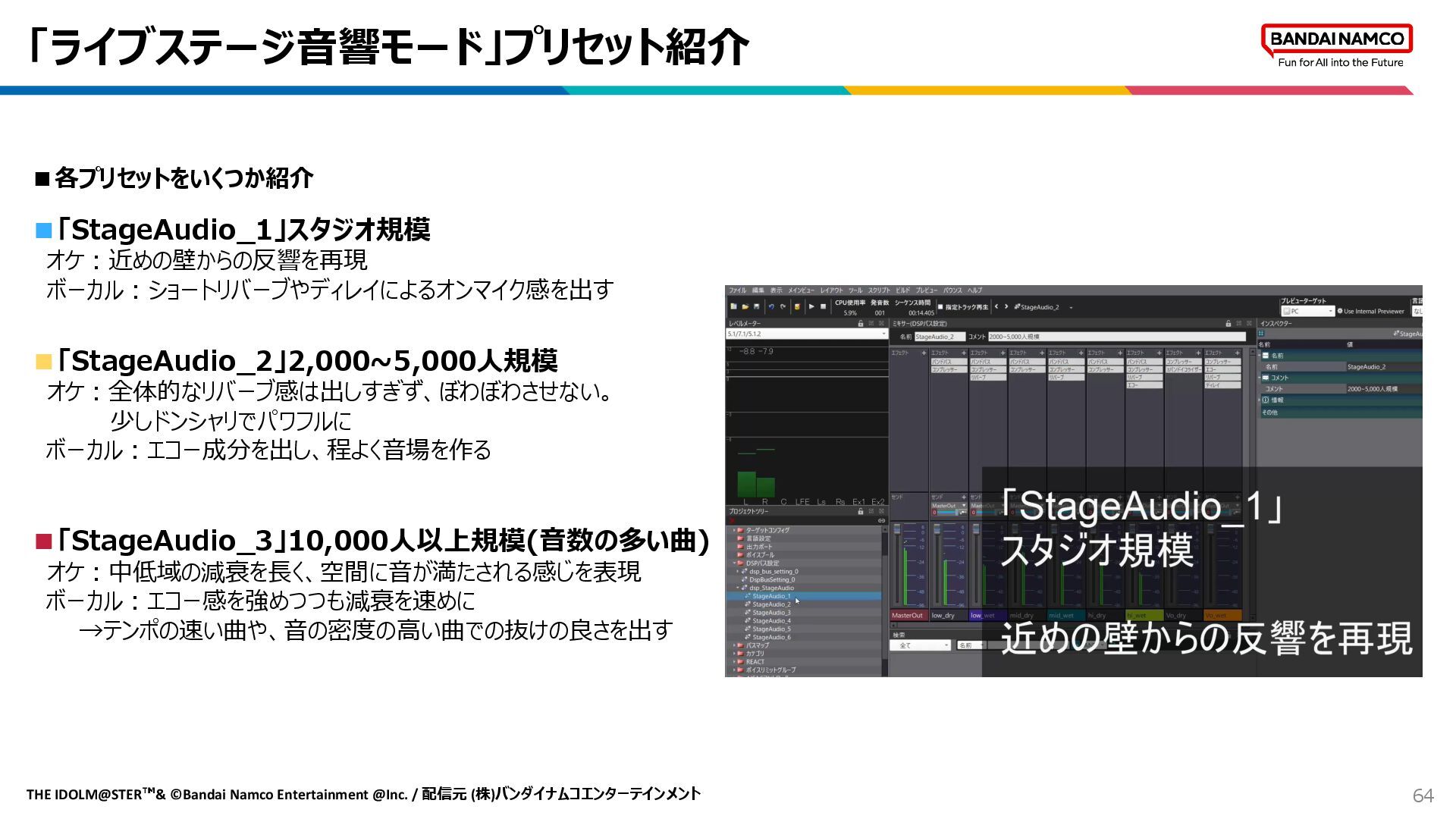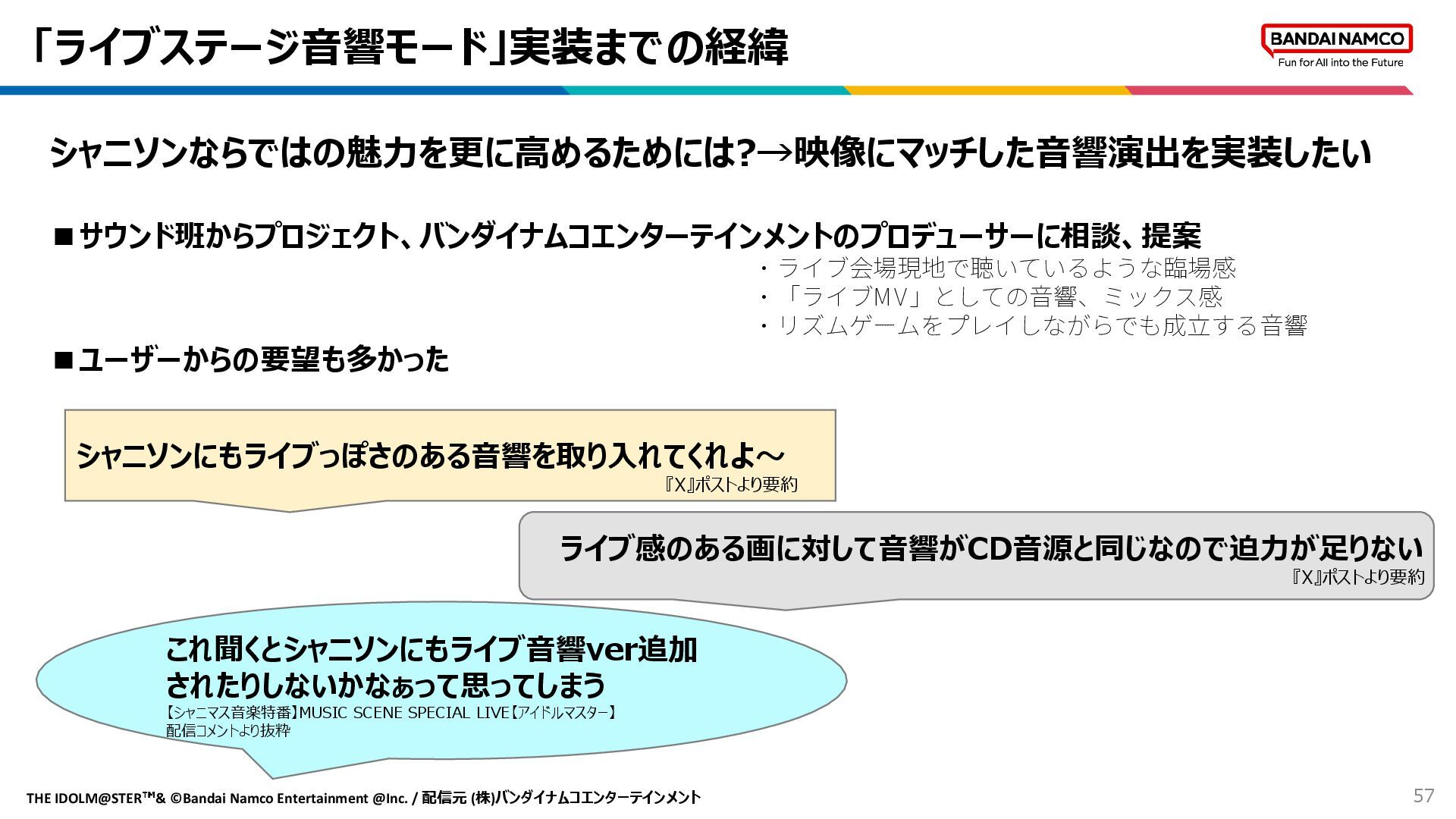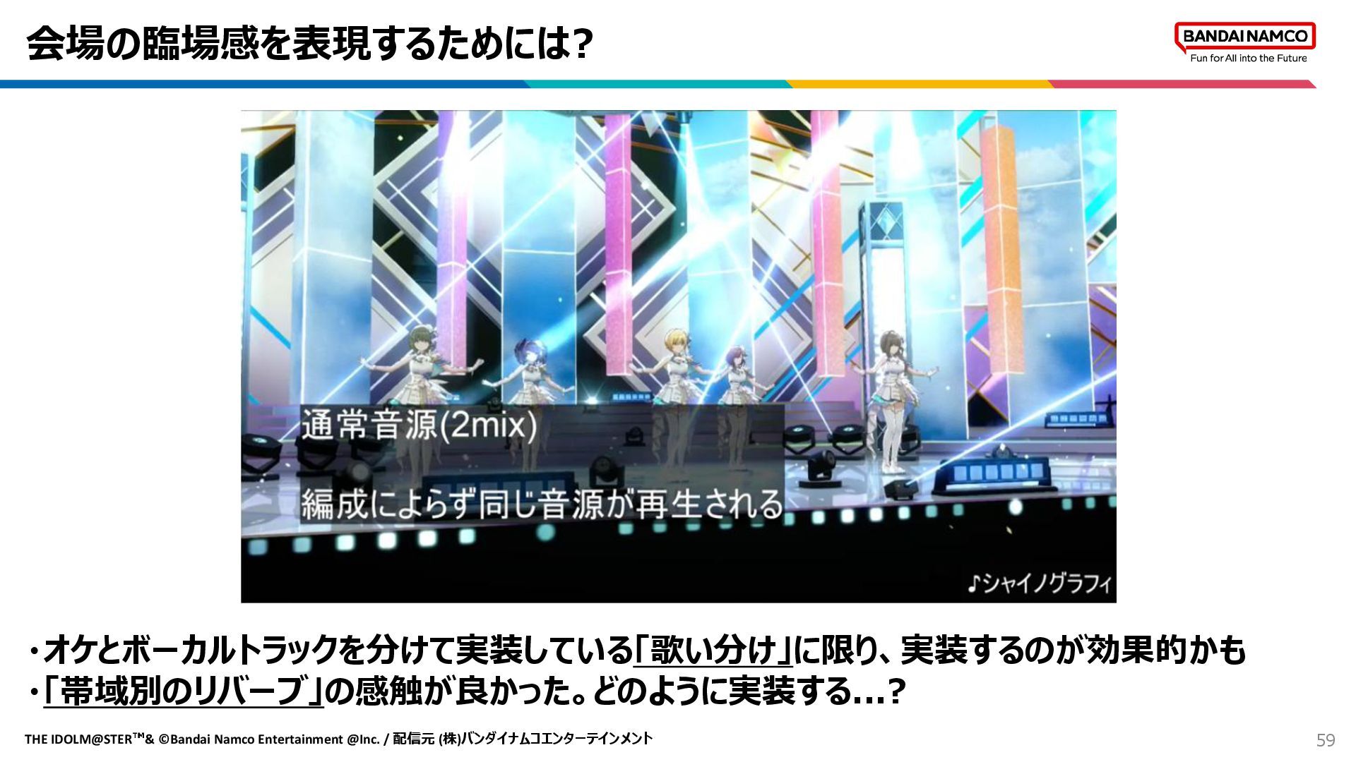 「シャニソン」のMV(ライブシーン)では、まるで現地のライブ会場にいるかのような没入感を高めるサウンド演出「ライブステージ音響モード」を搭載しています。