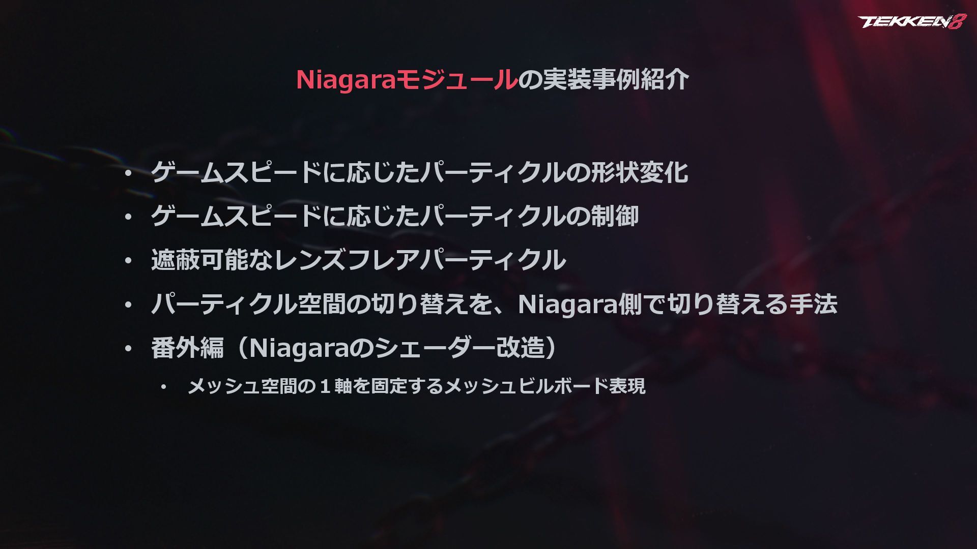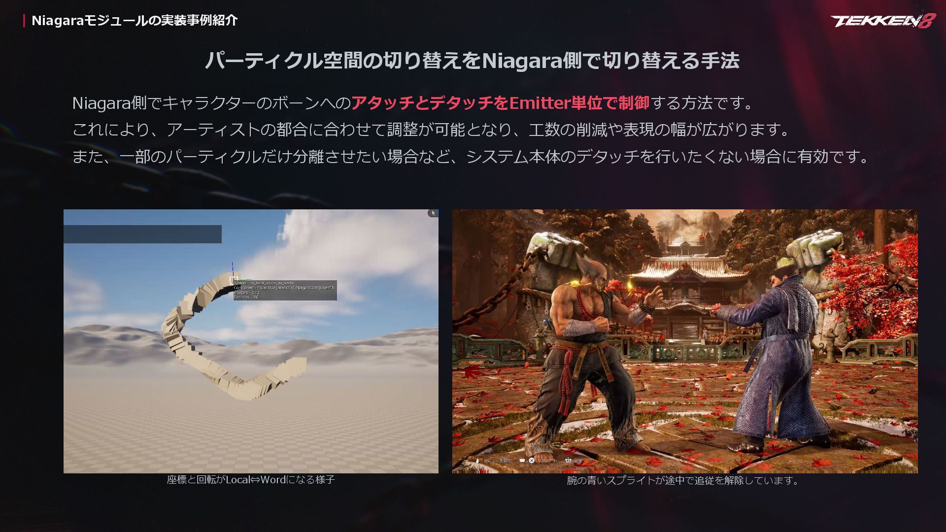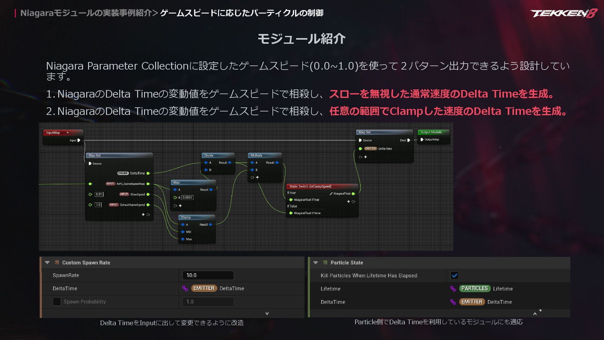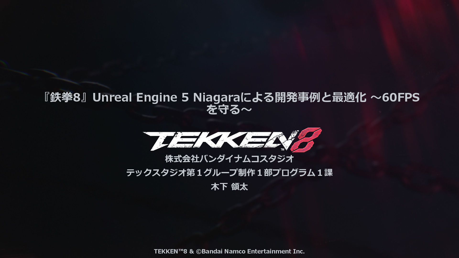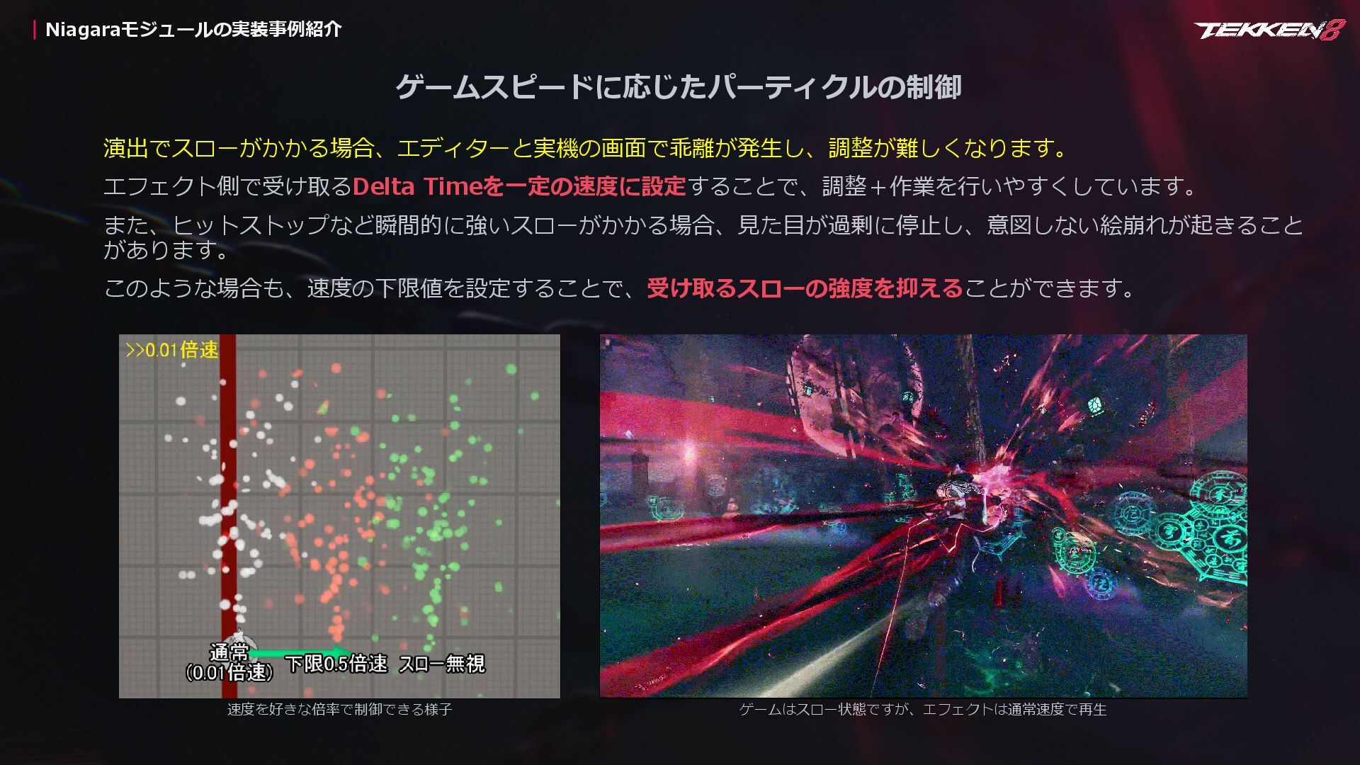 「鉄拳8」VFX開発におけるNiagaraモジュールの実装事例と 膨大なアセットを扱いながら60FPSを維持するためのNiagaraの最適化事例について紹介します。