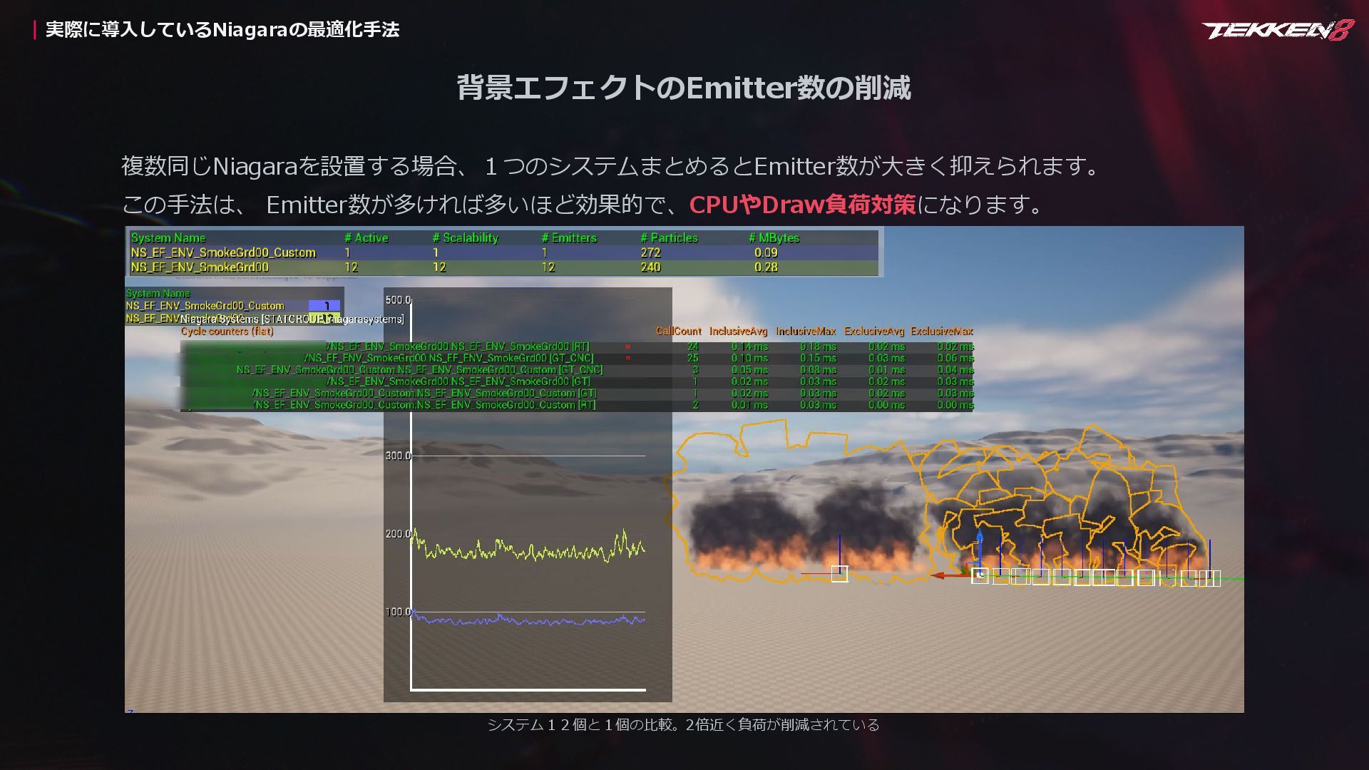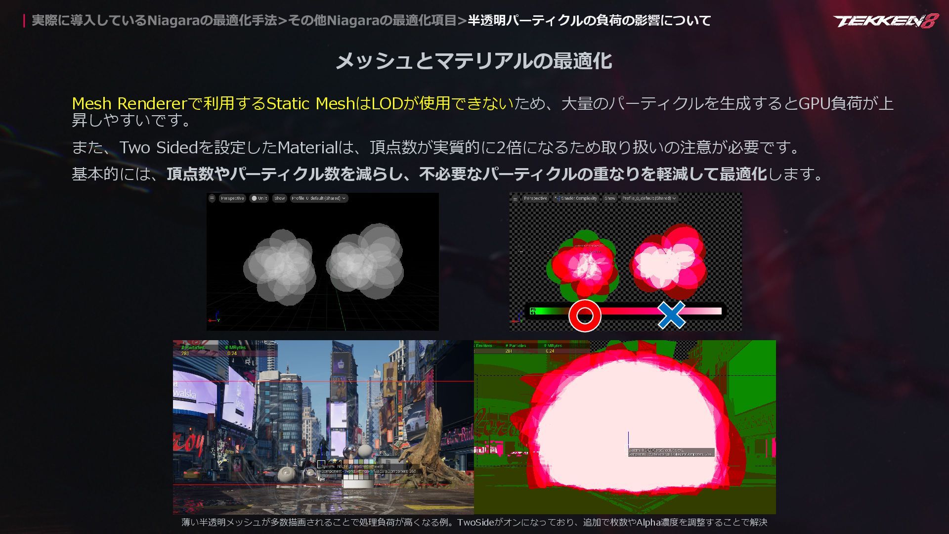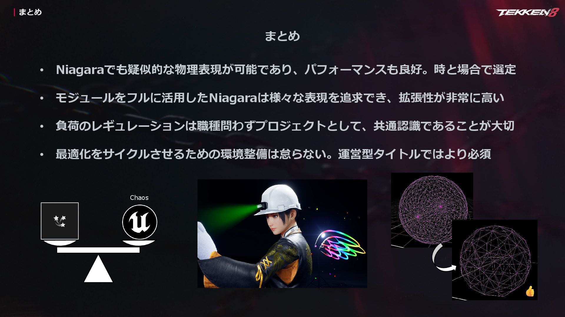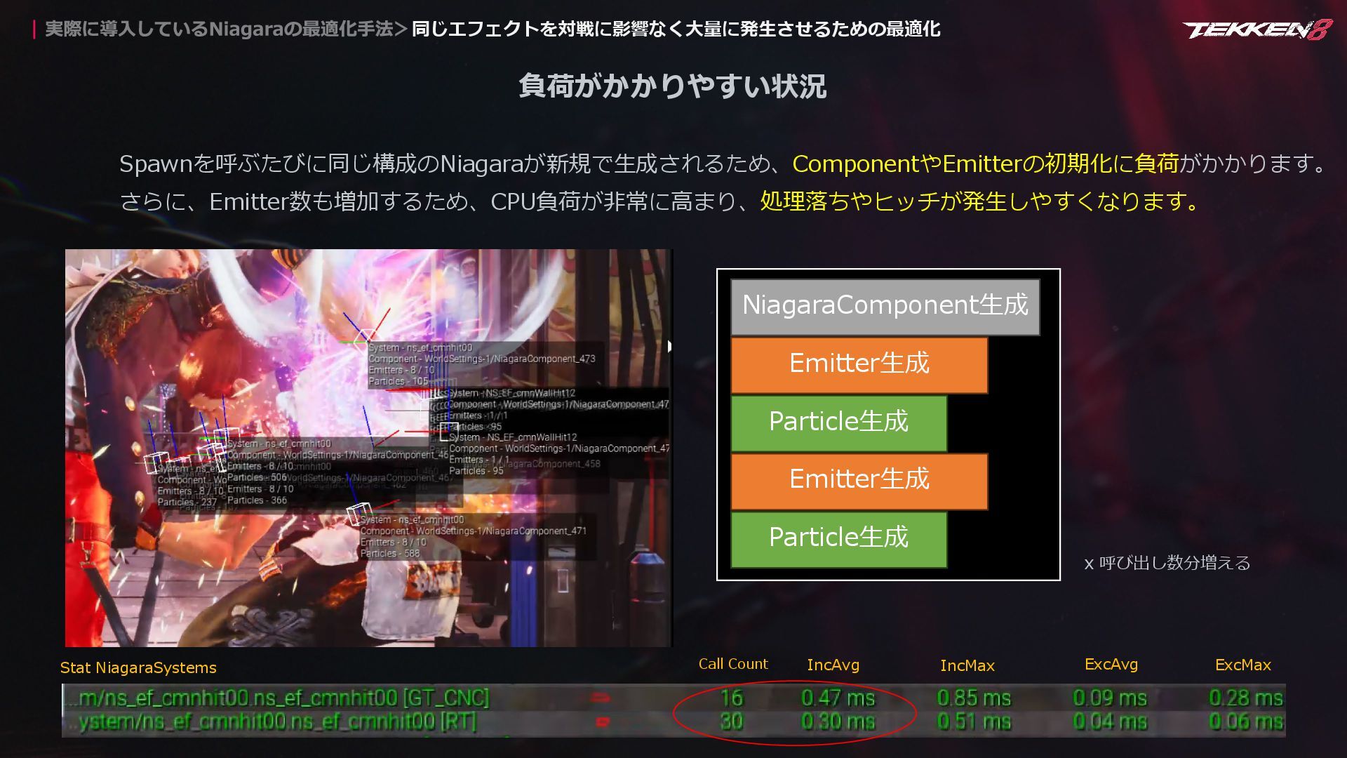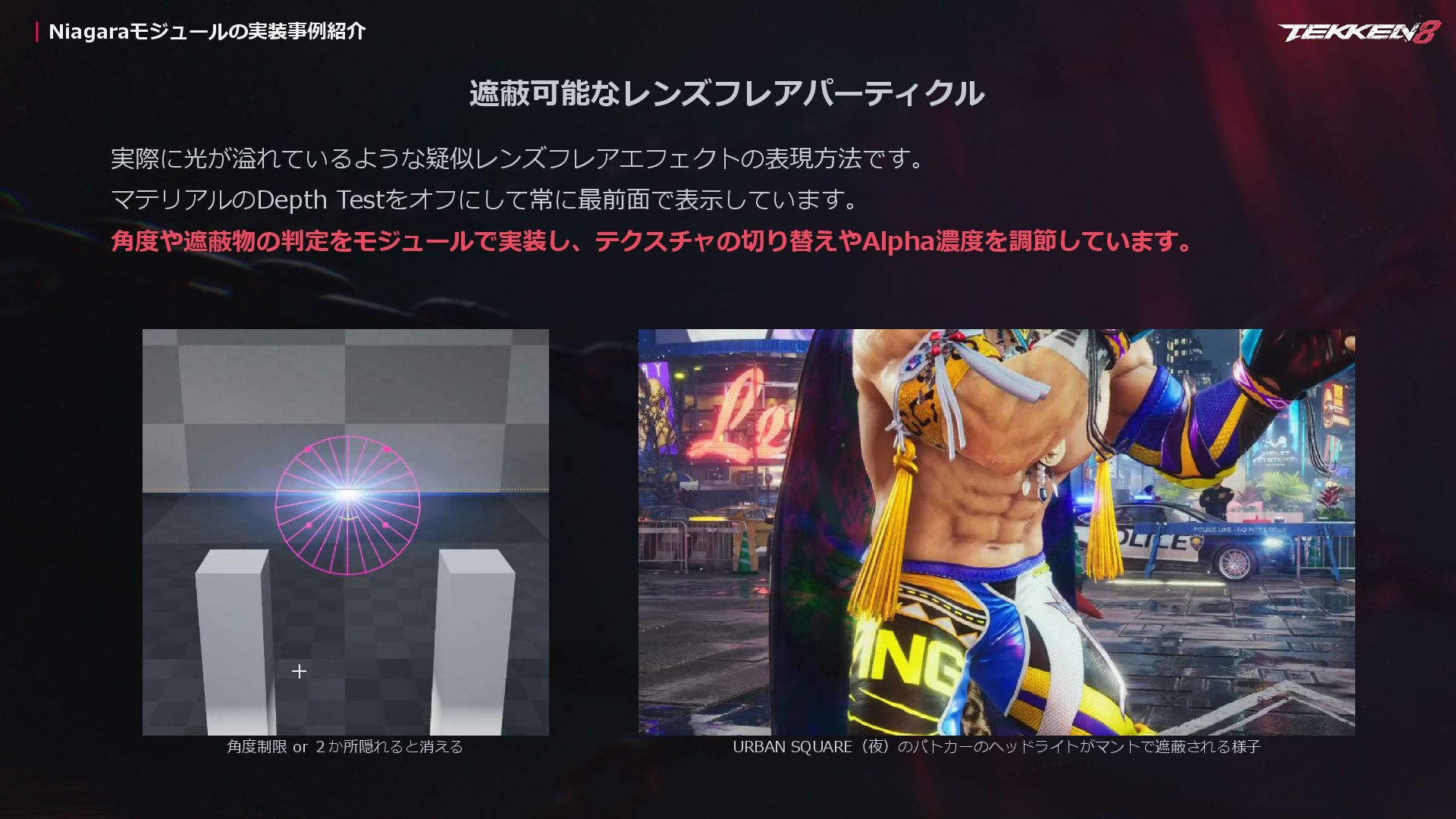 「鉄拳8」VFX開発におけるNiagaraモジュールの実装事例と 膨大なアセットを扱いながら60FPSを維持するためのNiagaraの最適化事例について紹介します。