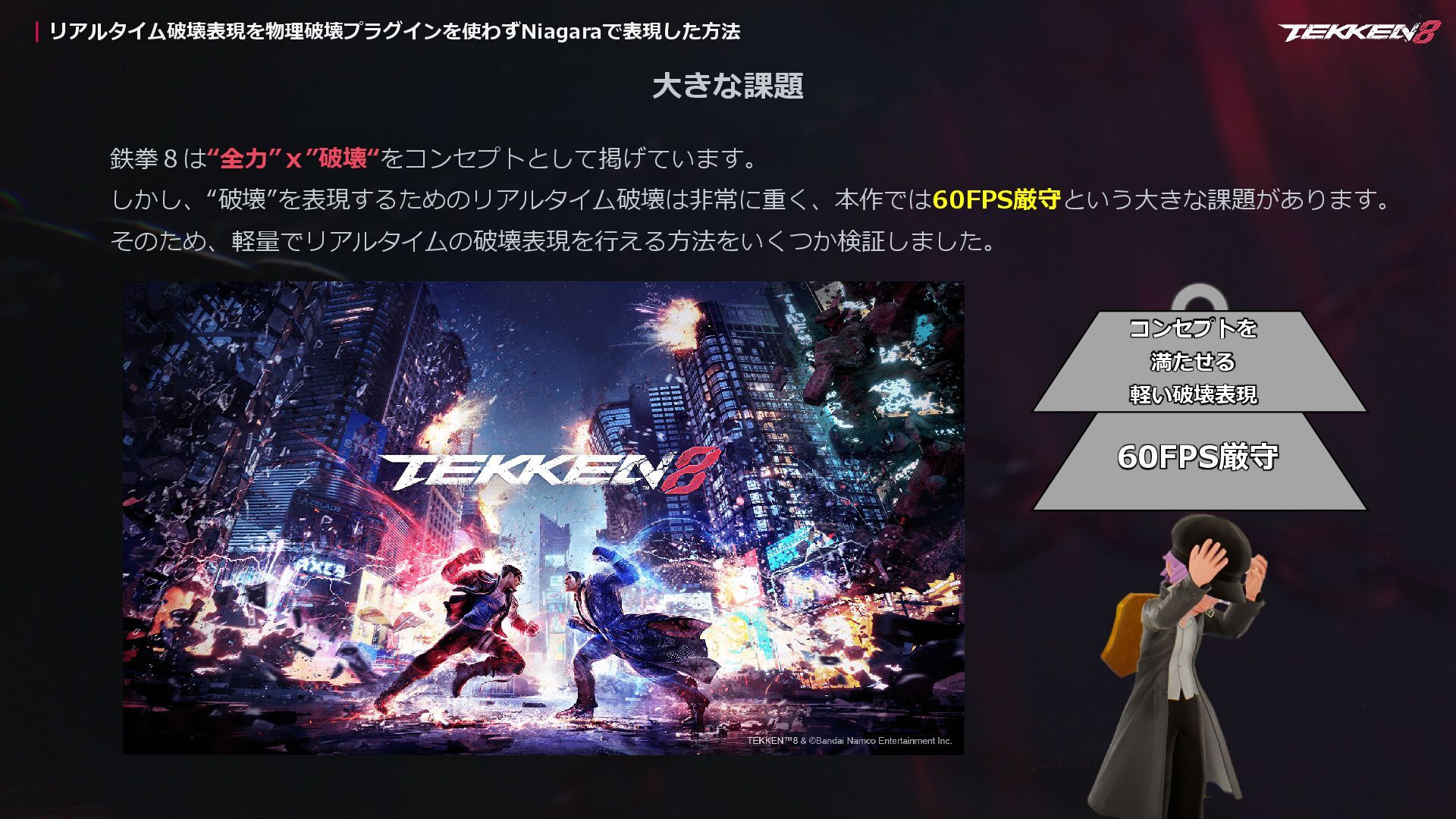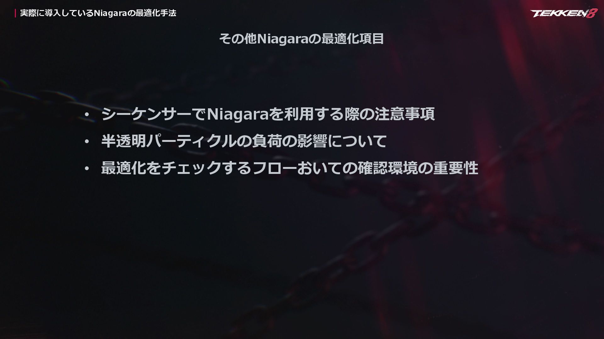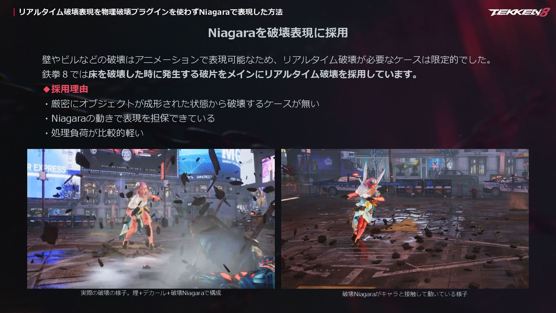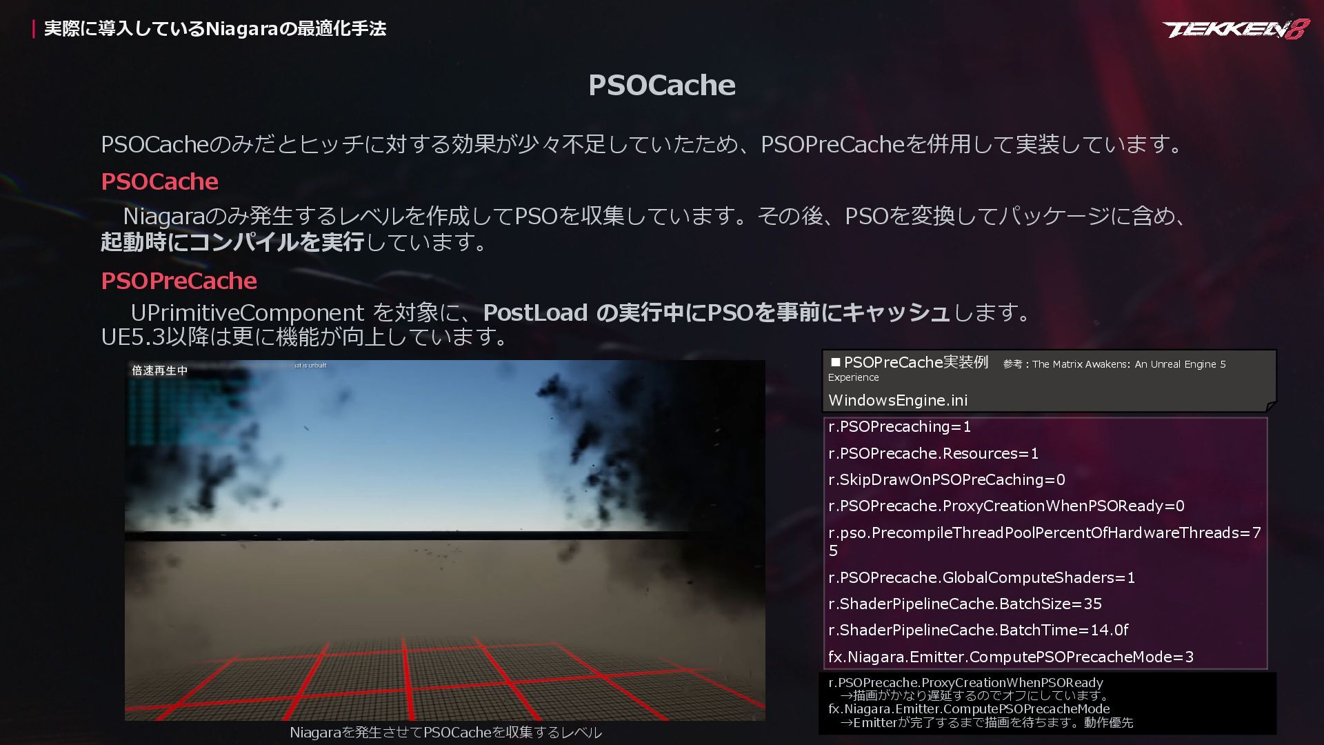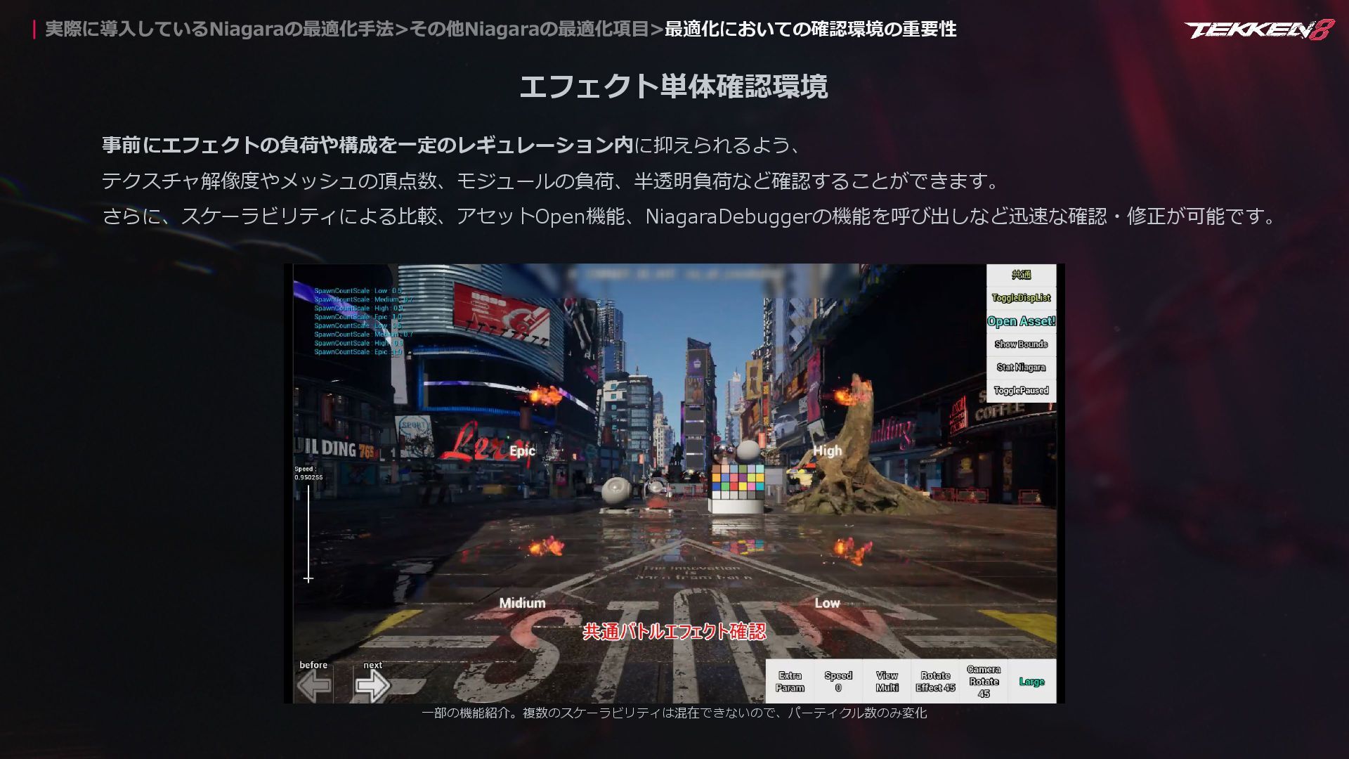 「鉄拳8」VFX開発におけるNiagaraモジュールの実装事例と 膨大なアセットを扱いながら60FPSを維持するためのNiagaraの最適化事例について紹介します。