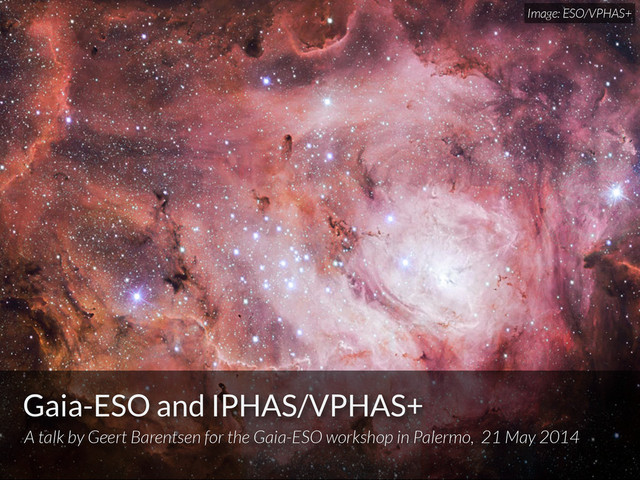 the ESO archive straight away. ‣ Pipeline-reduced images and single-band catalogues are delivered to the ESO archive in ~annual releases (DR1 April 2013; DR2 June 2014). ‣ Work has started on a globally-calibrated source catalogue, building on the experience gained with IPHAS. ‣ Talk to us to obtain preview catalogues. Keep an eye on our website: http://www.vphas.eu