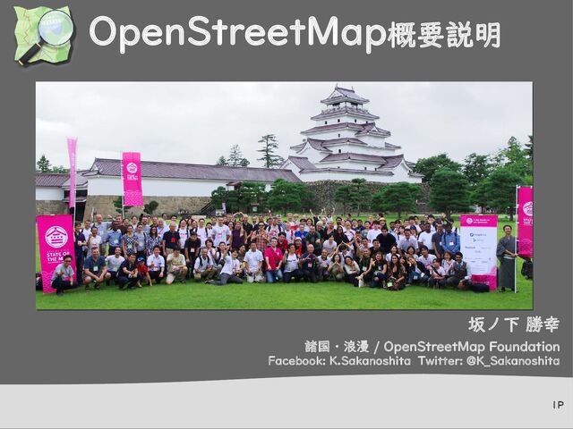 1P 1P OpenStreetMap概要説明 坂ノ下 勝幸 諸国・浪漫 / OpenStreetMap Foundation Facebook: