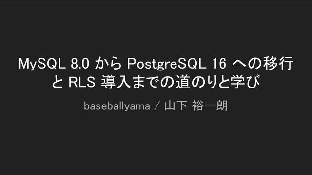 このスライドは、BtoB SaaSを展開するスタートアップ企業が、MySQL 8.0からPostgreSQL 16への移行を行い、さらにRow Level Security (RLS)を導入するまでの道のりを詳述しています。
