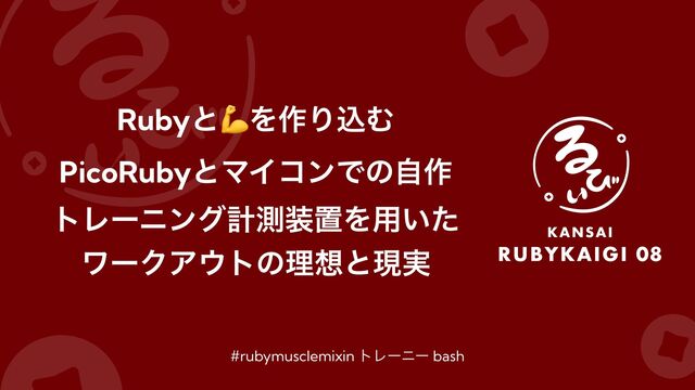 14:50~15:10 SESSION Rubyと💪を作り込む - PicoRubyとマイコンでの自作トレーニング計測装置を用いたワークアウトの理想と現実 https://regional.rubykaigi.org/kansai08/presentations/bash