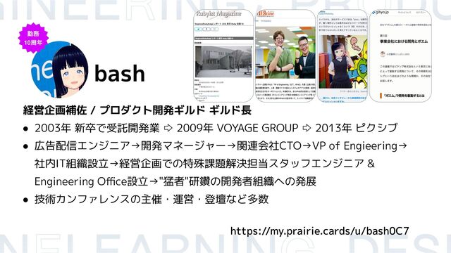 - https://my.prairie.cards/u/bash0C7 - https://magazine.rubyist.net/articles/0041/0041-TokyoRubyKaigi10Report_1st.html - https://hrzine.jp/article/detail/1678 - https://gihyo.jp/lifestyle/serial/01/poem-driven/0001