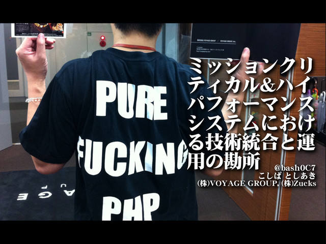 ミッションクリ ティカル&&ハイ パフォーマンス システムにおけ る技術統合と運 用の勘所 @@bbaasshh00CC77 こしば としあき ((株))VVOOYYAAGGEE