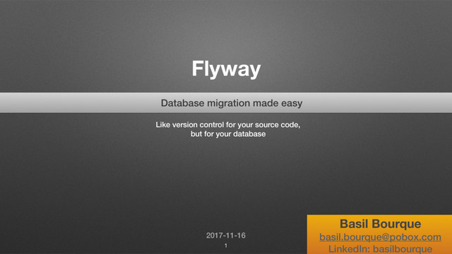 Introduction to [Flyway](http://www.FlywayDB.org/), the open-source tool for migrating your database changes between your dev-test-QA-prod systems. Evolve your database schema easily and reliably across all your instances. Like version control for your code, but for your database.