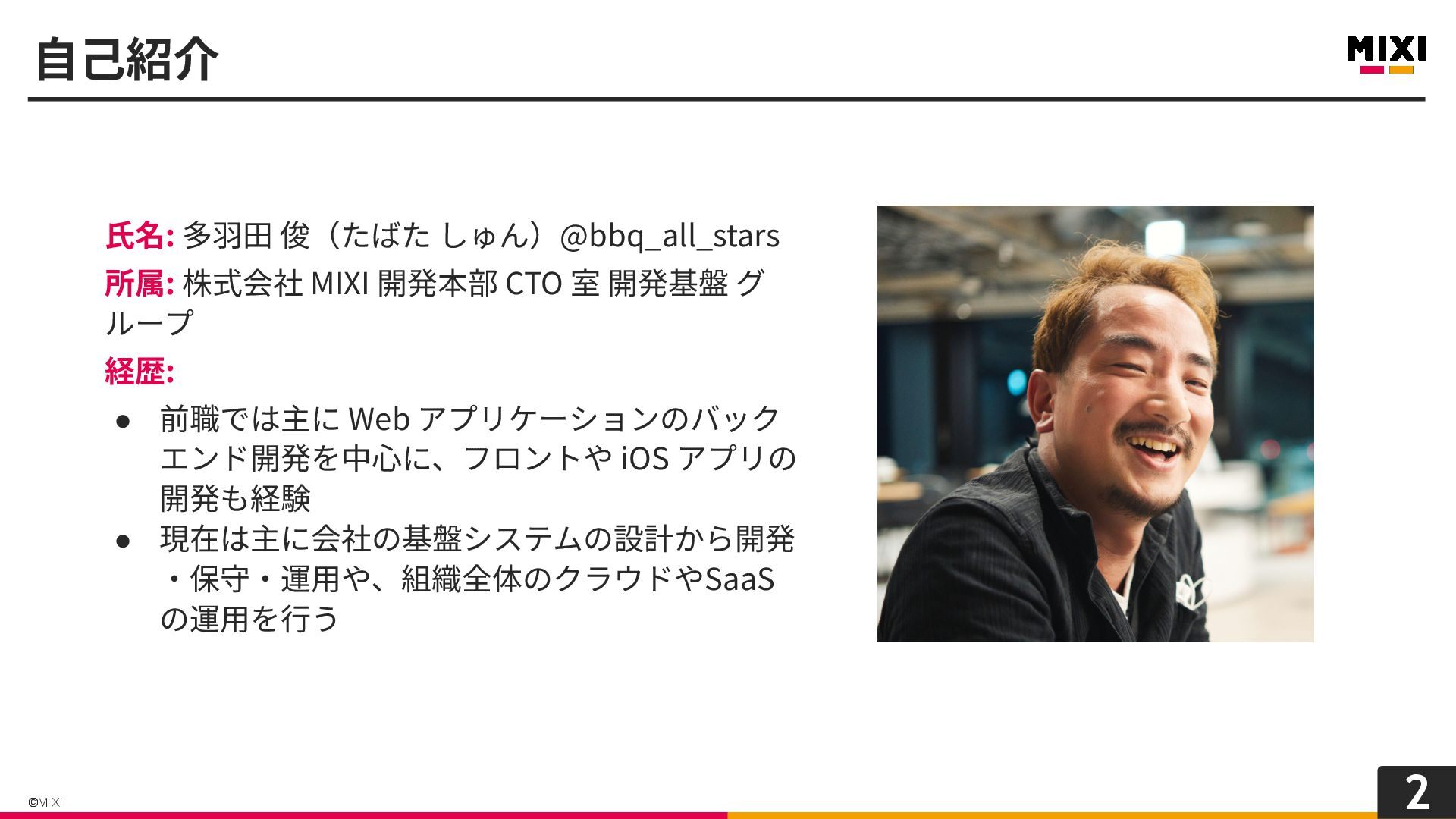 2. ©MIXI 2 ⽒名: 多⽻⽥ 俊(たばた しゅん)@bbq_all_stars 所属: 株式会社 MIXI 開発本部
