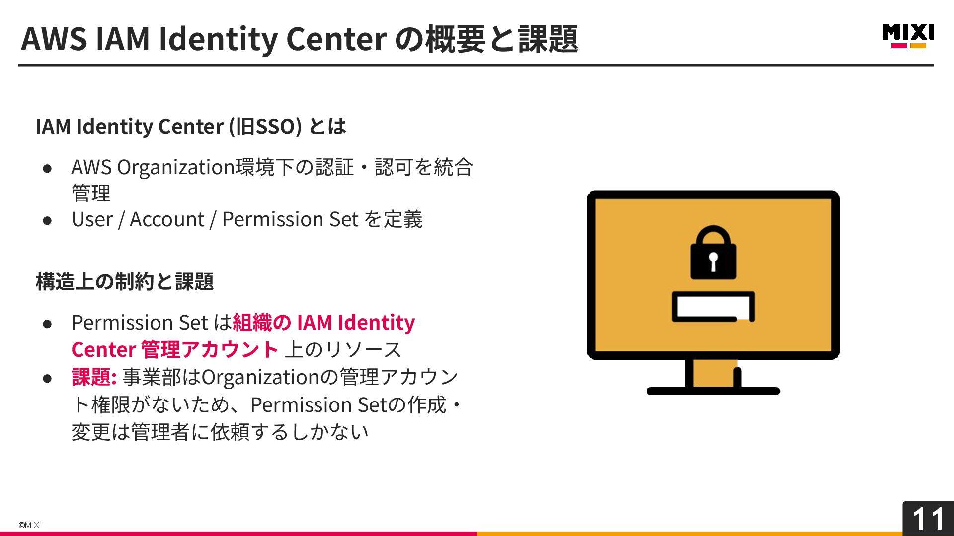 8. ©MIXI 11 IAM Identity Center (旧SSO) とは • AWS Organization環境下の認証‧認可を統合