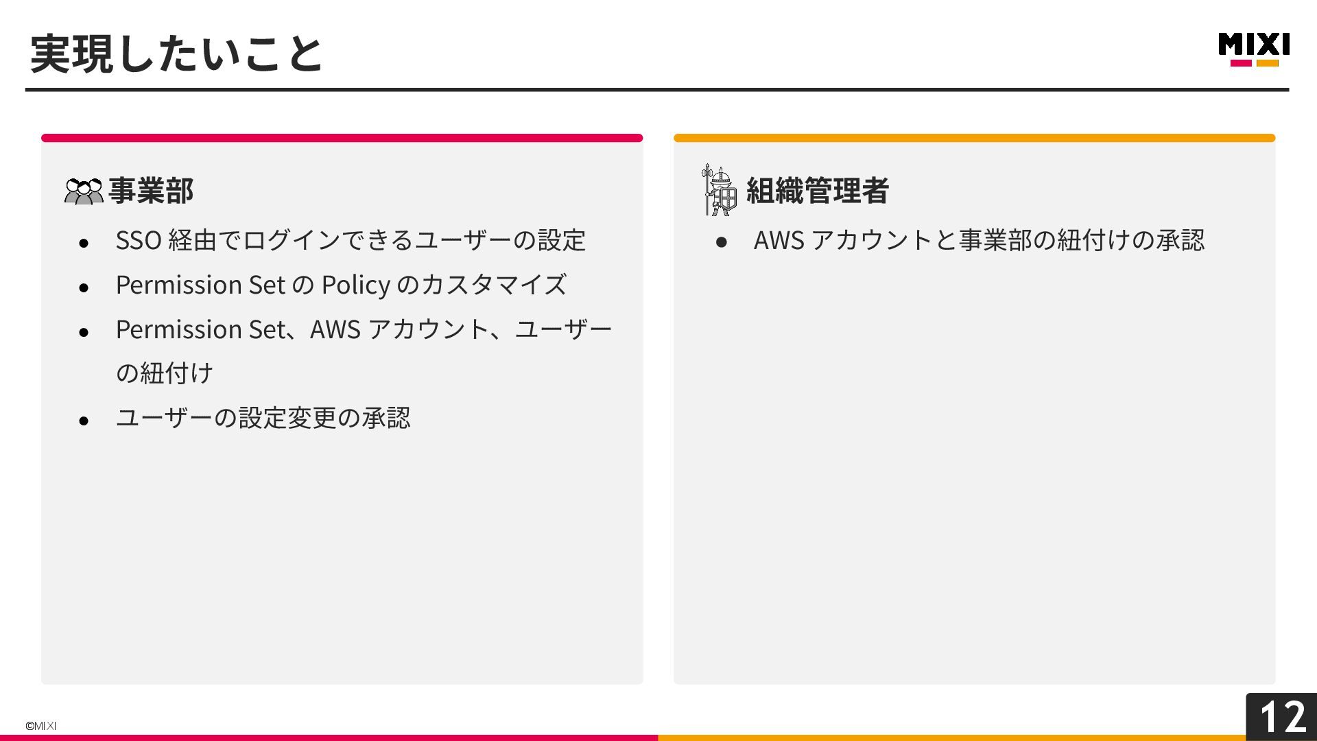 9. ©MIXI 12 実現したいこと   事業部 • SSO 経由でログインできるユーザーの設定 • Permission
