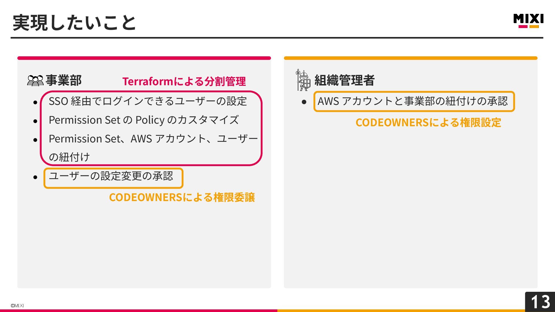 Set の Policy のカスタマイズ • Permission Set、AWS アカウント、ユーザー の紐付け • ユーザーの設定変更の承認   組織管理者 • AWS アカウントと事業部の紐付けの承認 Terraformによる分割管理 CODEOWNERSによる権限委譲 CODEOWNERSによる権限設定