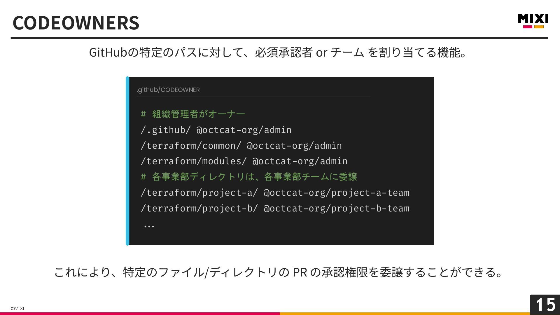 12. ©MIXI 15 GitHubの特定のパスに対して、必須承認者 or チーム を割り当てる機能。 これにより、特定のファイル/ディレクトリの PR の承認権限を委譲することができる。 CODEOWNERS