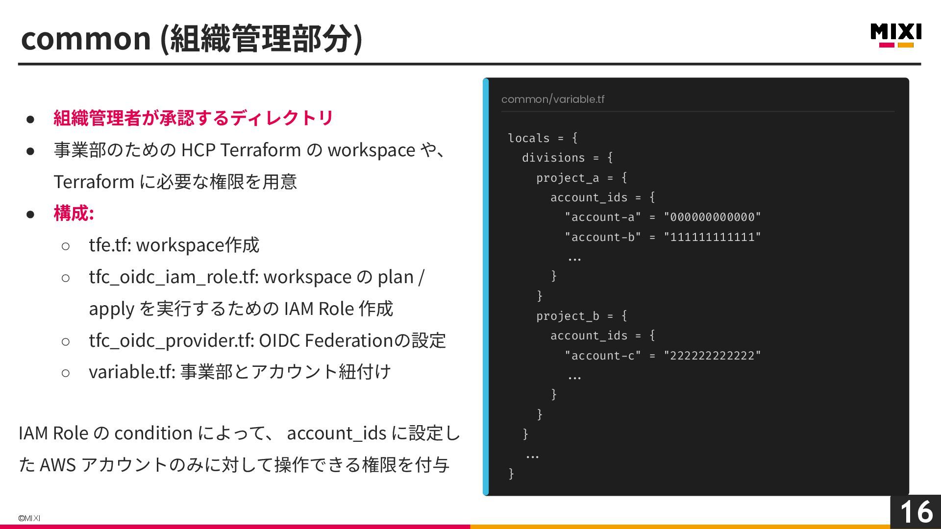 や、 Terraform に必要な権限を⽤意 • 構成: ◦ tfe.tf: workspace作成 ◦ tfc_oidc_iam_role.tf: workspace の plan / apply を実⾏するための IAM Role 作成 ◦ tfc_oidc_provider.tf: OIDC Federationの設定 ◦ variable.tf: 事業部とアカウント紐付け IAM Role の condition によって、 account_ids に設定し た AWS アカウントのみに対して操作できる権限を付与 common (組織管理部分) common/variable.tf locals = { divisions = { project_a = { account_ids = { "account-a" = "000000000000" "account-b" = "111111111111" ... } } project_b = { account_ids = { "account-c" = "222222222222" ... } } } ... }