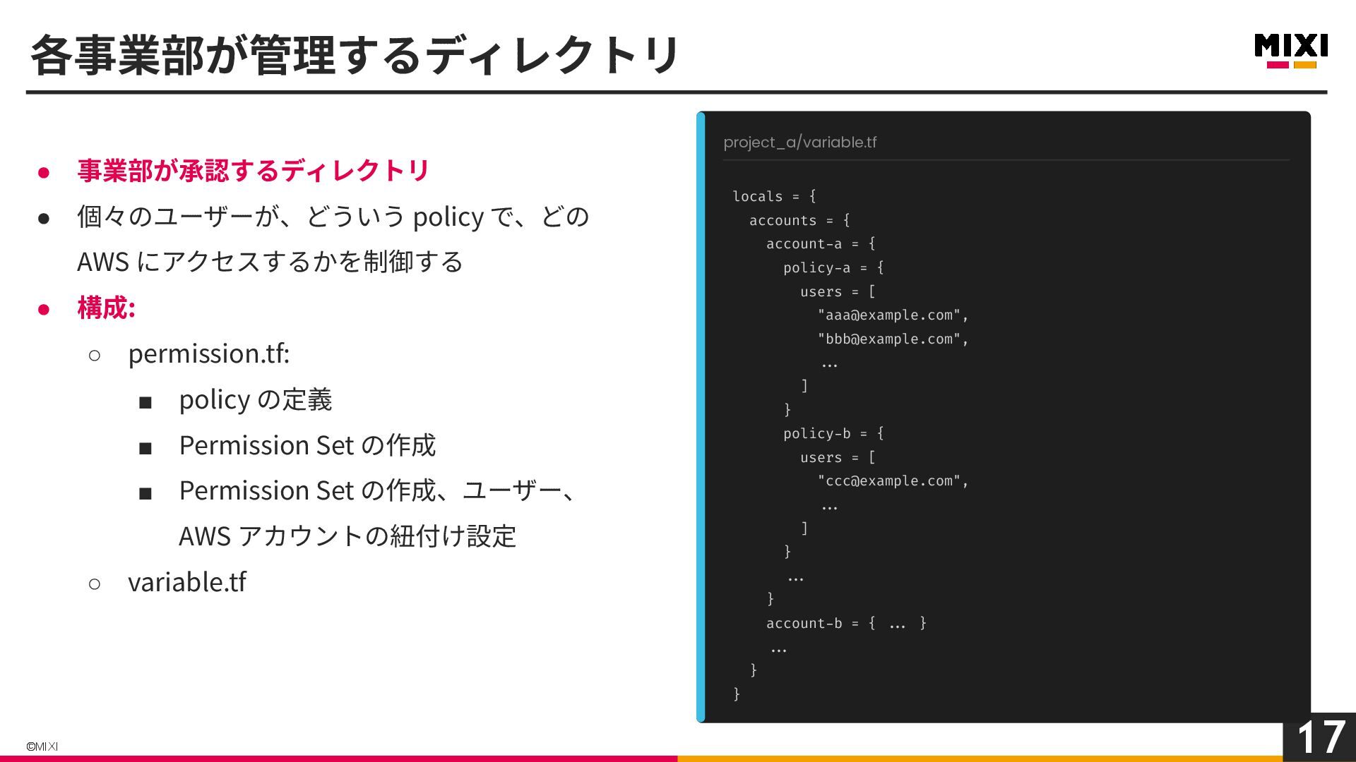 • 構成: ◦ permission.tf: ▪ policy の定義 ▪ Permission Set の作成 ▪ Permission Set の作成、ユーザー、 AWS アカウントの紐付け設定 ◦ variable.tf 各事業部が管理するディレクトリ project_a/variable.tf locals = { accounts = { account-a = { policy-a = { users = [ "[email protected]", "[email protected]", ... ] } policy-b = { users = [ "[email protected]", ... ] } ... } account-b = { ... } ... } }