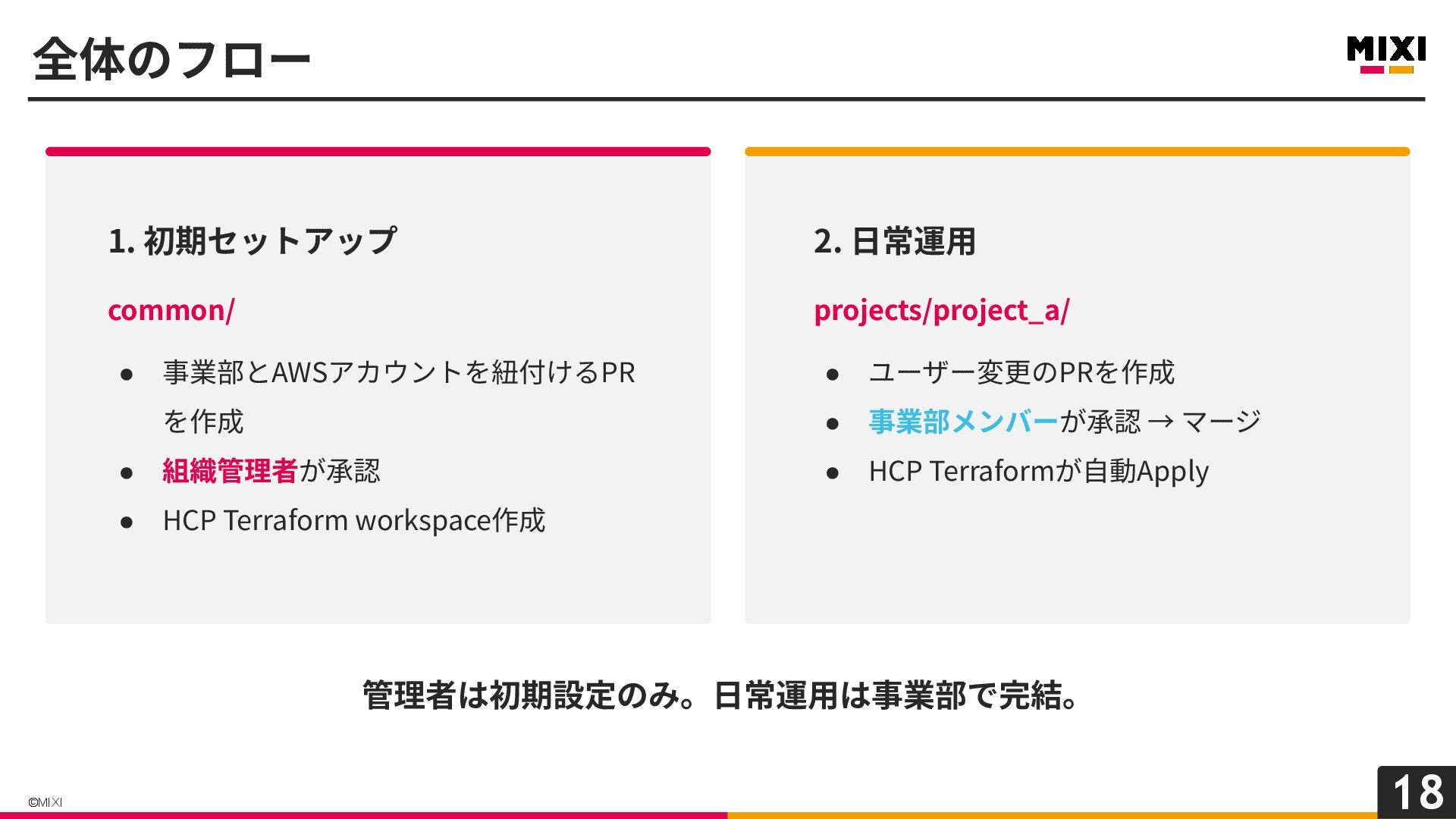15. ©MIXI 18 全体のフロー 1. 初期セットアップ common/ • 事業部とAWSアカウントを紐付けるPR を作成 •